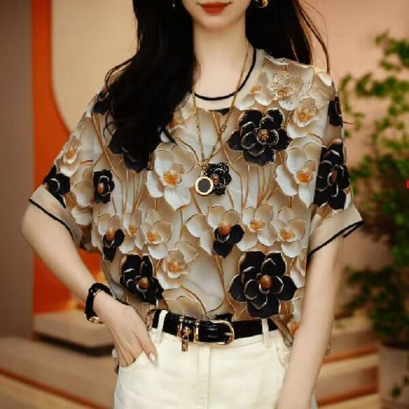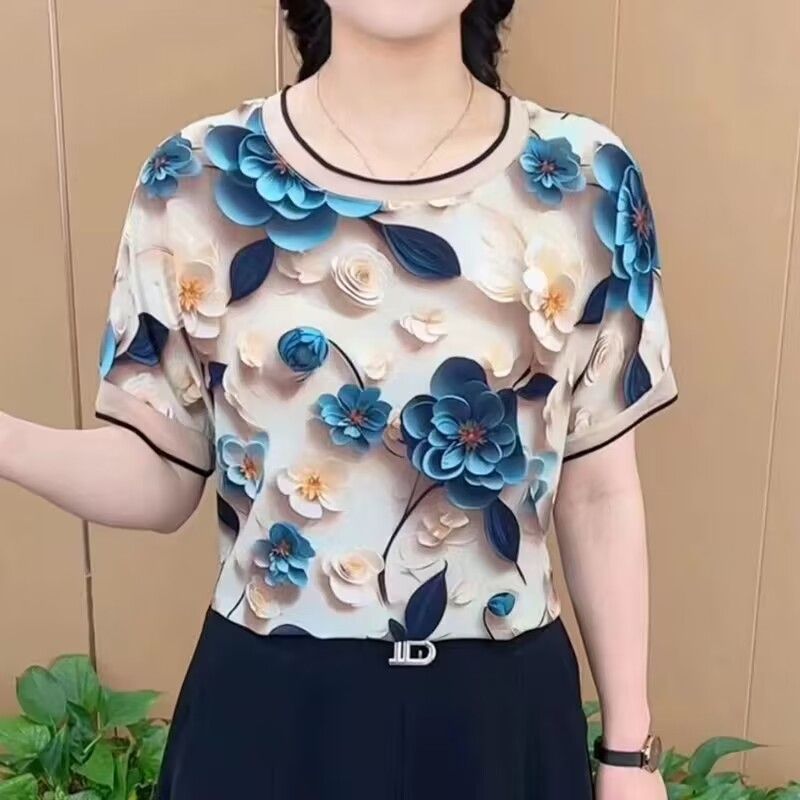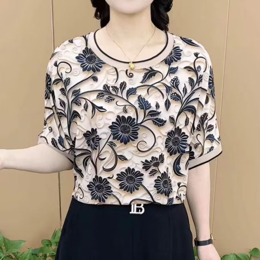 t恤女2025夏季 气质小衫 新款 洋气妈妈装 显瘦减龄圆领上衣 大码 短袖