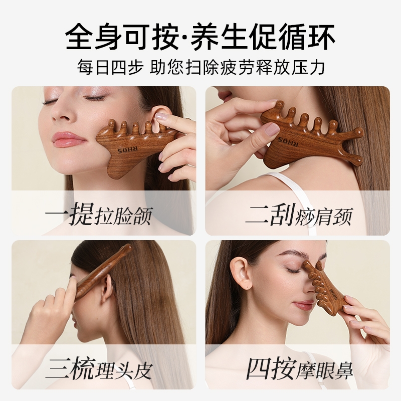 RHOS四合一多功能檀木梳头部疗刮痧疏通经络神器脸部眼部头皮按摩