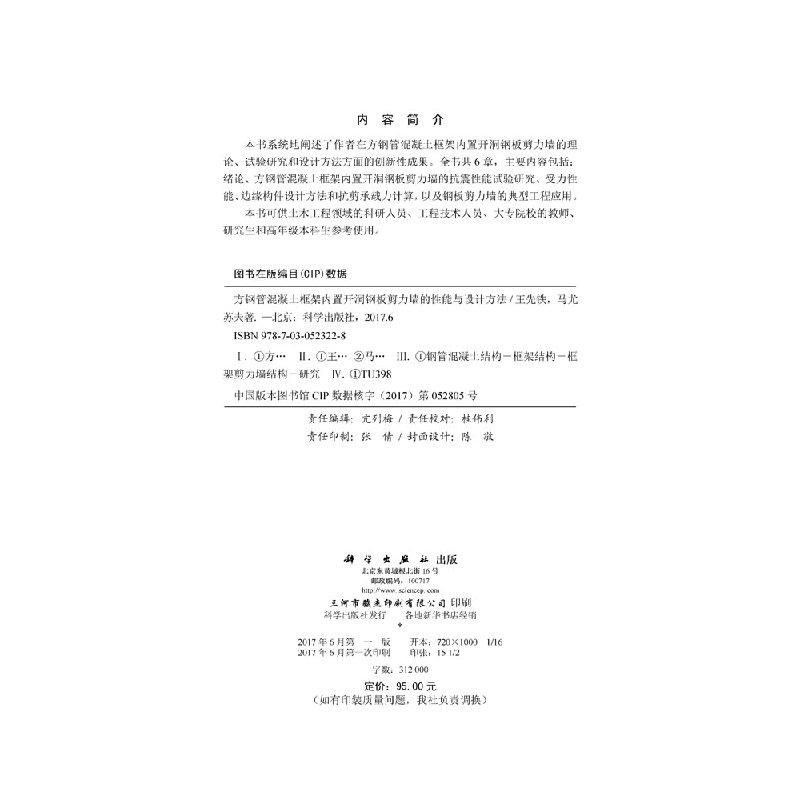 方钢管混凝土框架内置开洞钢板剪力墙 科学出版 性能与设计方法 马尤苏夫 社 王先铁 全新正版