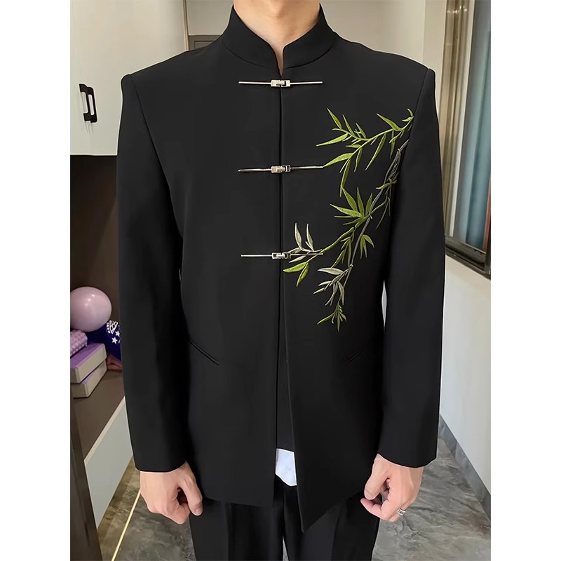 男套装 正装 新郎结婚订婚礼服高级感垫肩立领西服 飞机扣西装 新中式