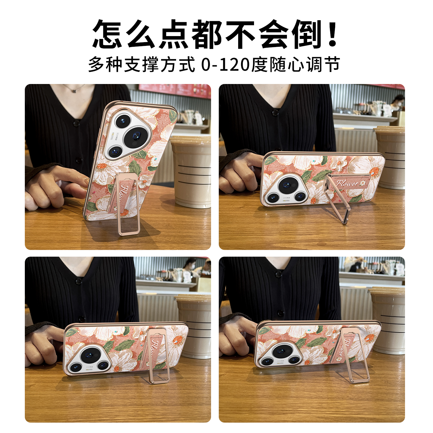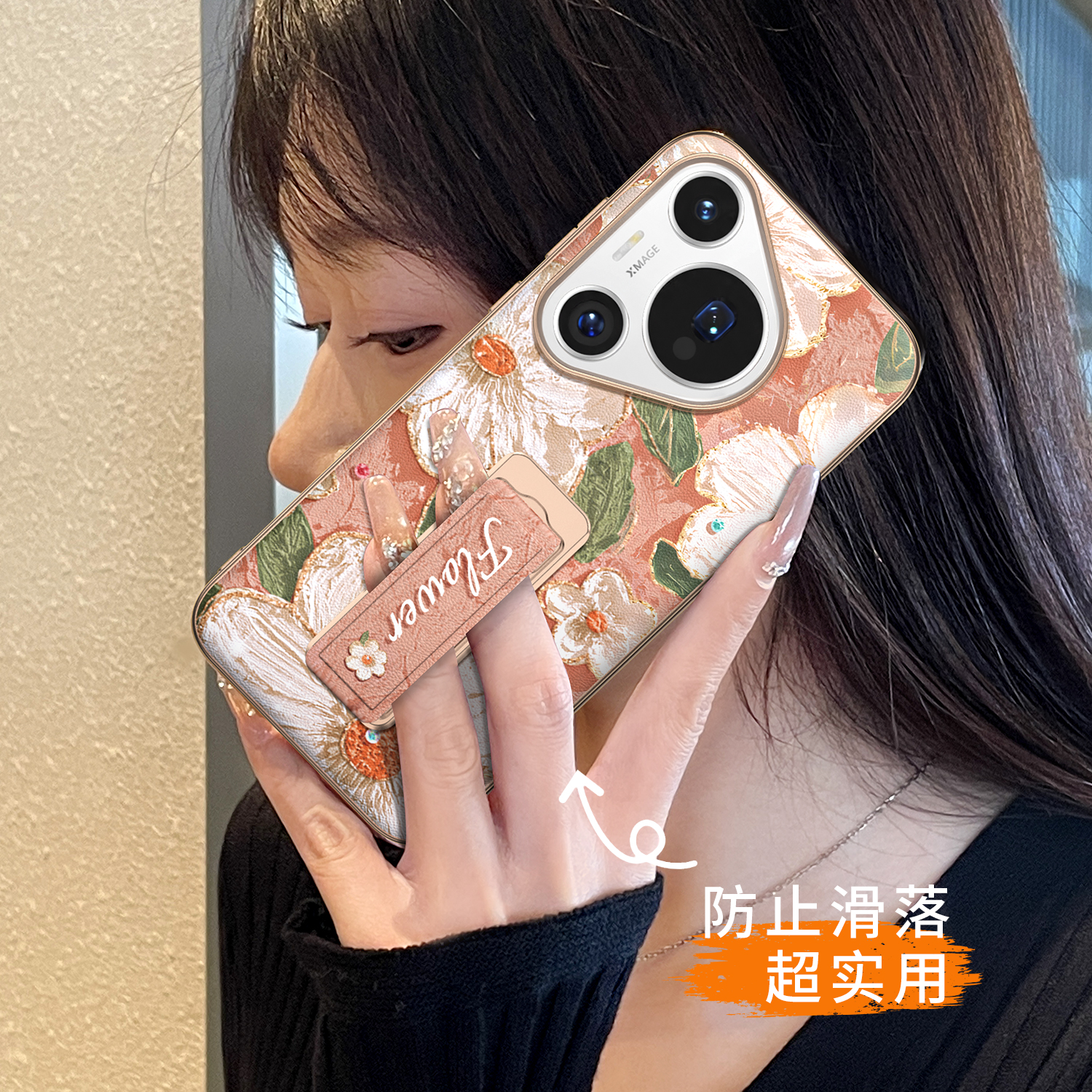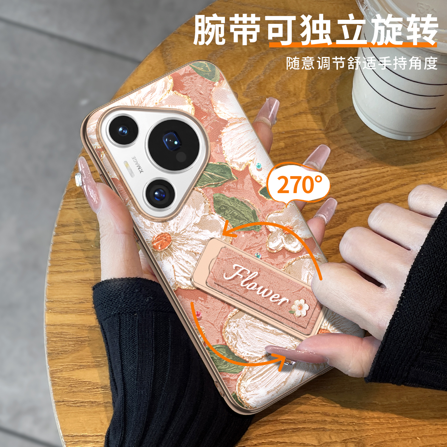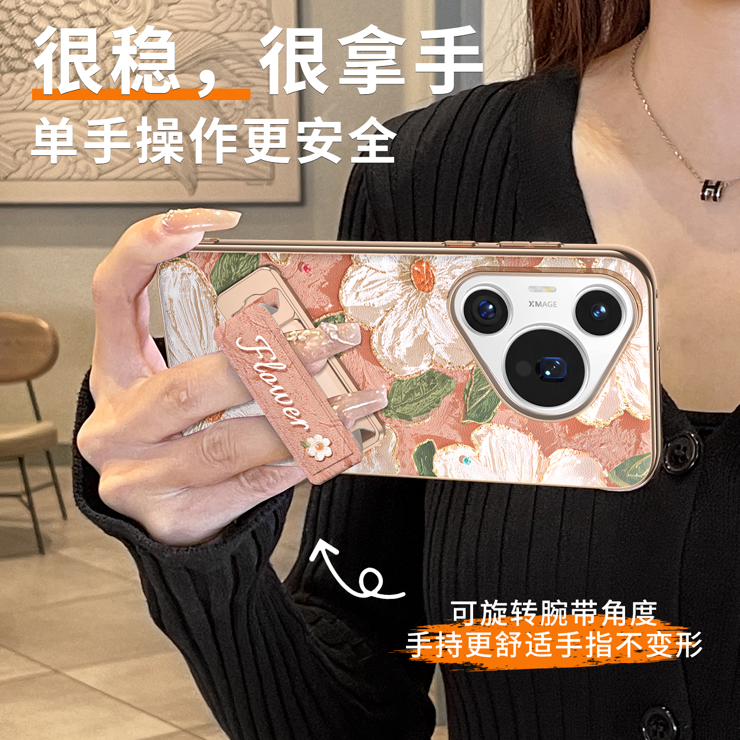 油画山茶花适用华为pura70pro手机壳新款 高档素皮ultra超薄无边框轻奢防摔prua半包保护 腕带旋转支架p70por