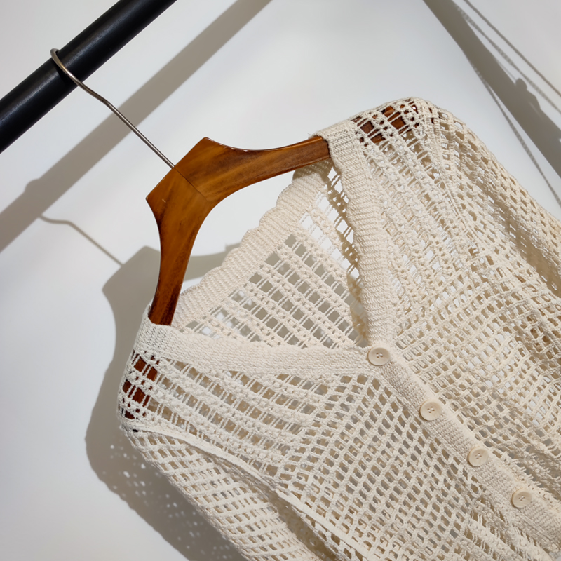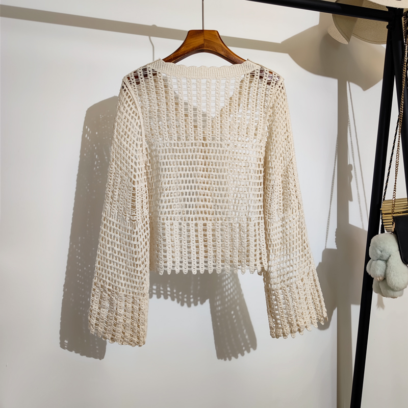 波西米亚度假风宽松v领长袖 新款 防晒上衣 女夏季 勾花镂空针织开衫