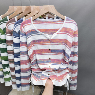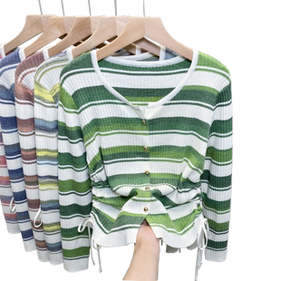 外穿上衣抽绳防晒衣 条纹空调衫 圆领冰丝针织开衫 女2025春夏秋新款