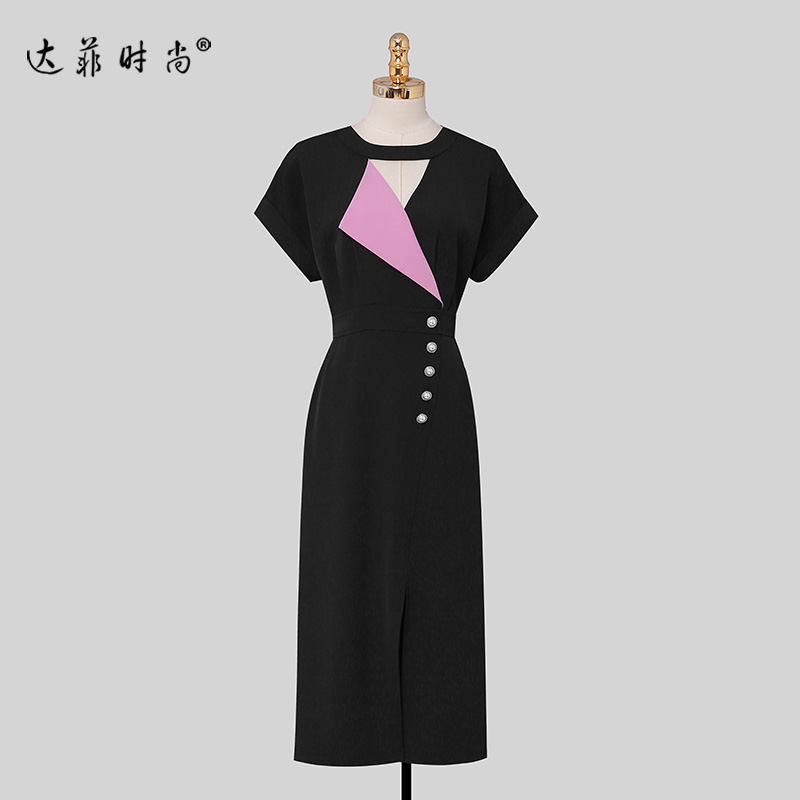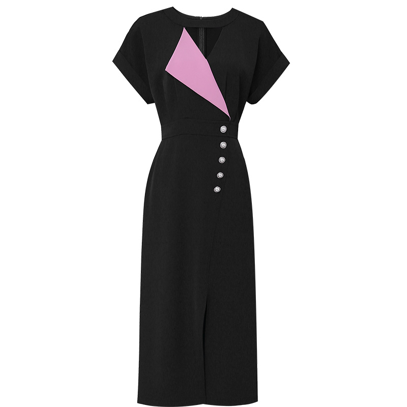 气质圆领撞色拼接收腰A摆开衩连衣裙 时尚 2025夏季 新款