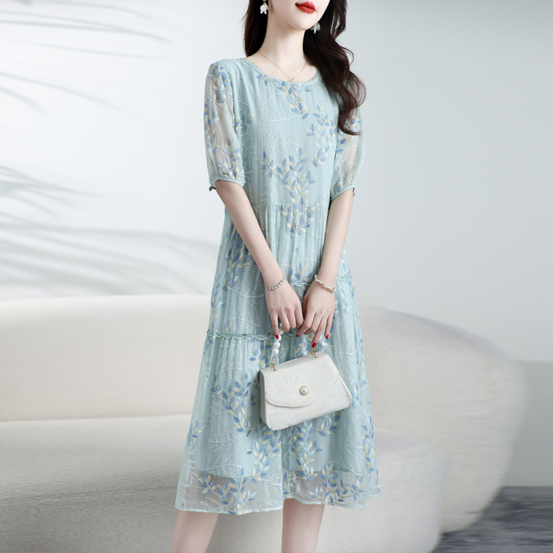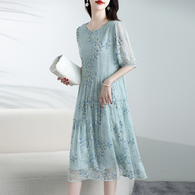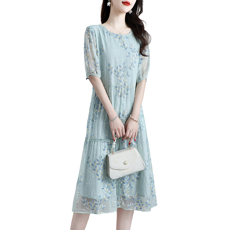 新款 高级刺绣真丝连衣裙女妈妈气质洋气精致绣花桑蚕丝裙子夏季