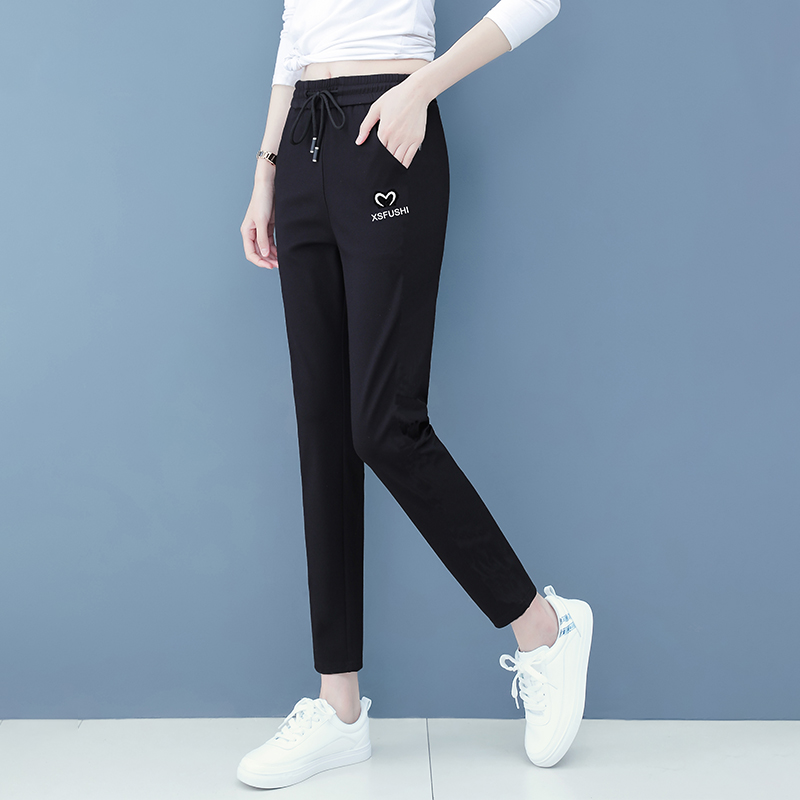 女夏季 高腰显瘦刺绣弹力小脚裤 薄款 2025新款 冰丝九分休闲裤 运动裤