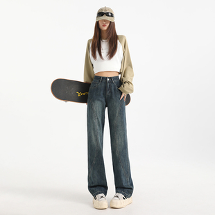 拼接直筒阔腿裤 牛仔裤 潮流高腰胖mm显瘦复古美式 时尚 女2025年新款