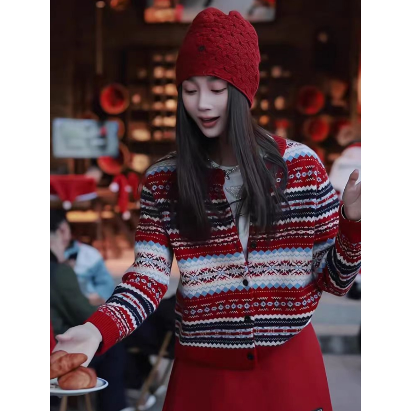一整套ootd穿搭韩系气质撞色条纹针织开衫 外套高腰显瘦半身裙套装