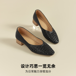 单鞋 羊皮浅口法式 千百度粗高跟鞋 异形跟职业通勤大码 静音系列