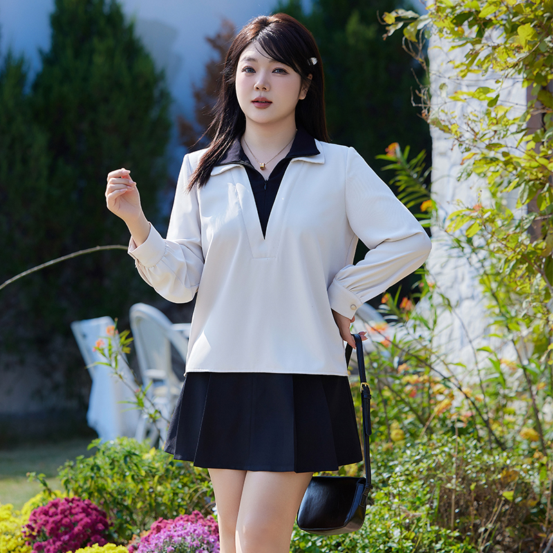 女上衣套头大码 2025秋装 两穿衬衫 假两件长袖 显瘦胖MM衬衣内搭 新款