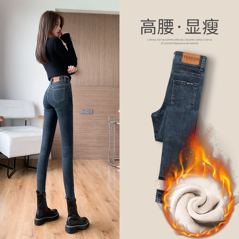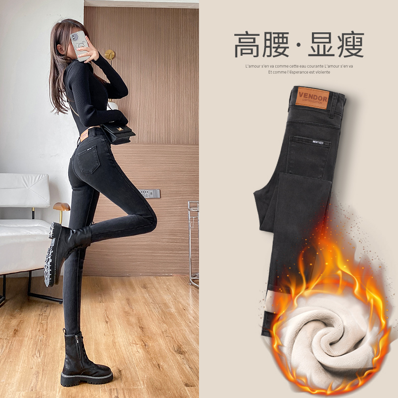 显瘦紧身铅笔小脚裤 新款 子女 女秋冬季 高腰黑色加绒加厚牛仔裤