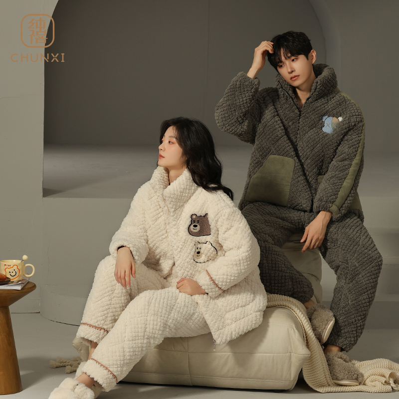 提花拉链刺绣小熊家居服外套装 珊瑚绒睡衣女冬季 保暖 双层加厚