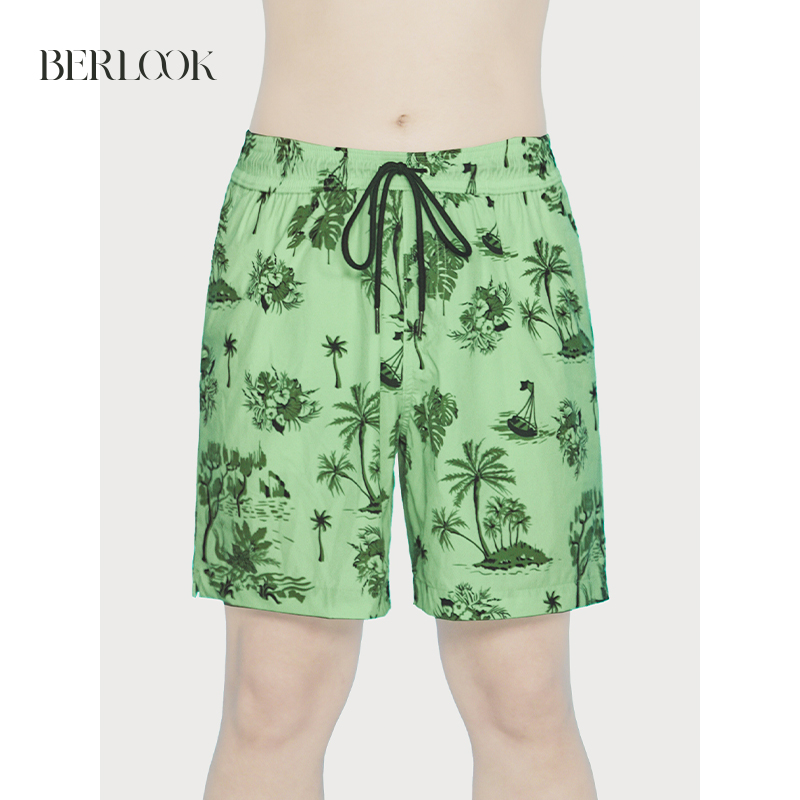 海边度假冲浪 夏季 BERLOOK繁花系列绿色椰树帆船印花男士 沙滩裤