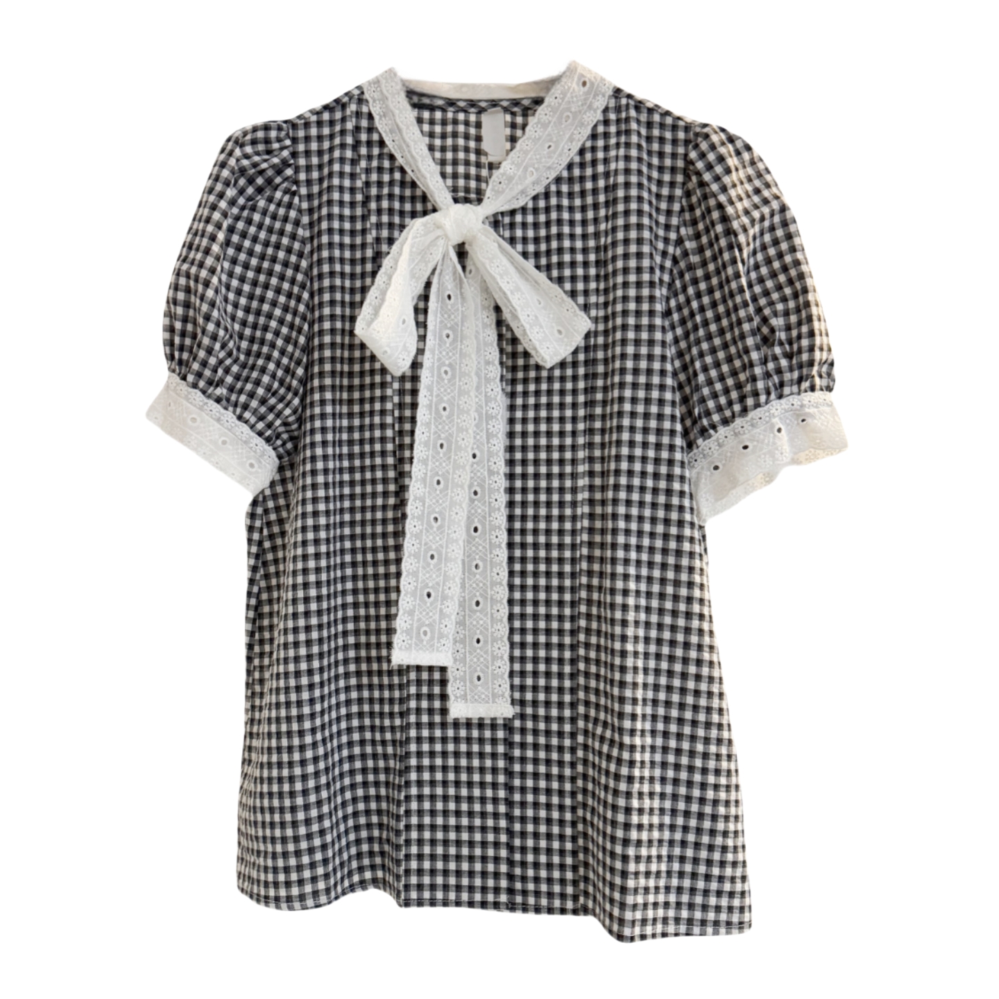 小衫 花边系带蝴蝶结格子短袖 复古泡泡袖 女2025夏宽松法式 上衣 衬衫