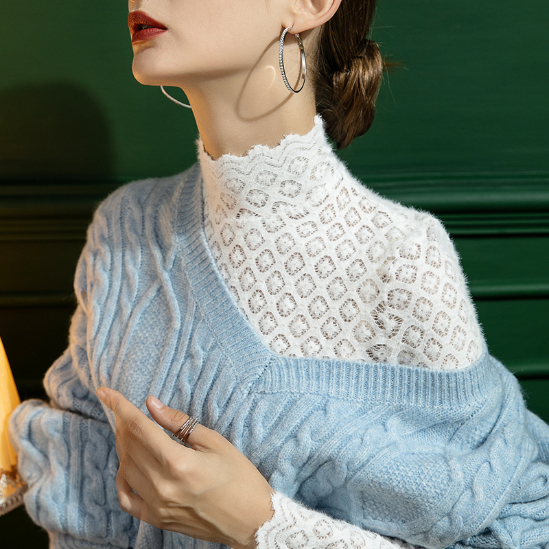 女修身 小衫 磨毛秋季 T恤镂空洋气上衣韩式 立领女装 高领蕾丝打底衫