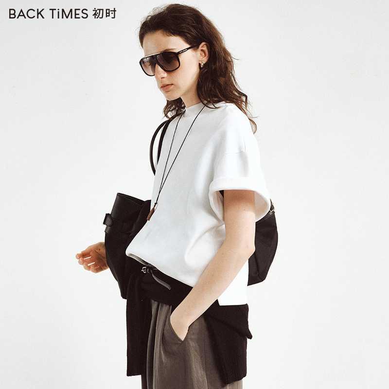 口纯棉宽松设计圆领短袖 初时 卷边袖 新品 T恤女 卷絮云棉