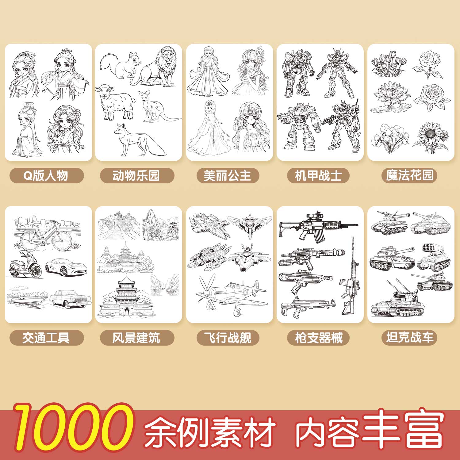 线稿描摹本6到12岁新手入门基础动物乐园Q版 人物机甲战士交通工具美丽公主魔法花园涂色风景建筑控笔训练幼儿园绘画训练