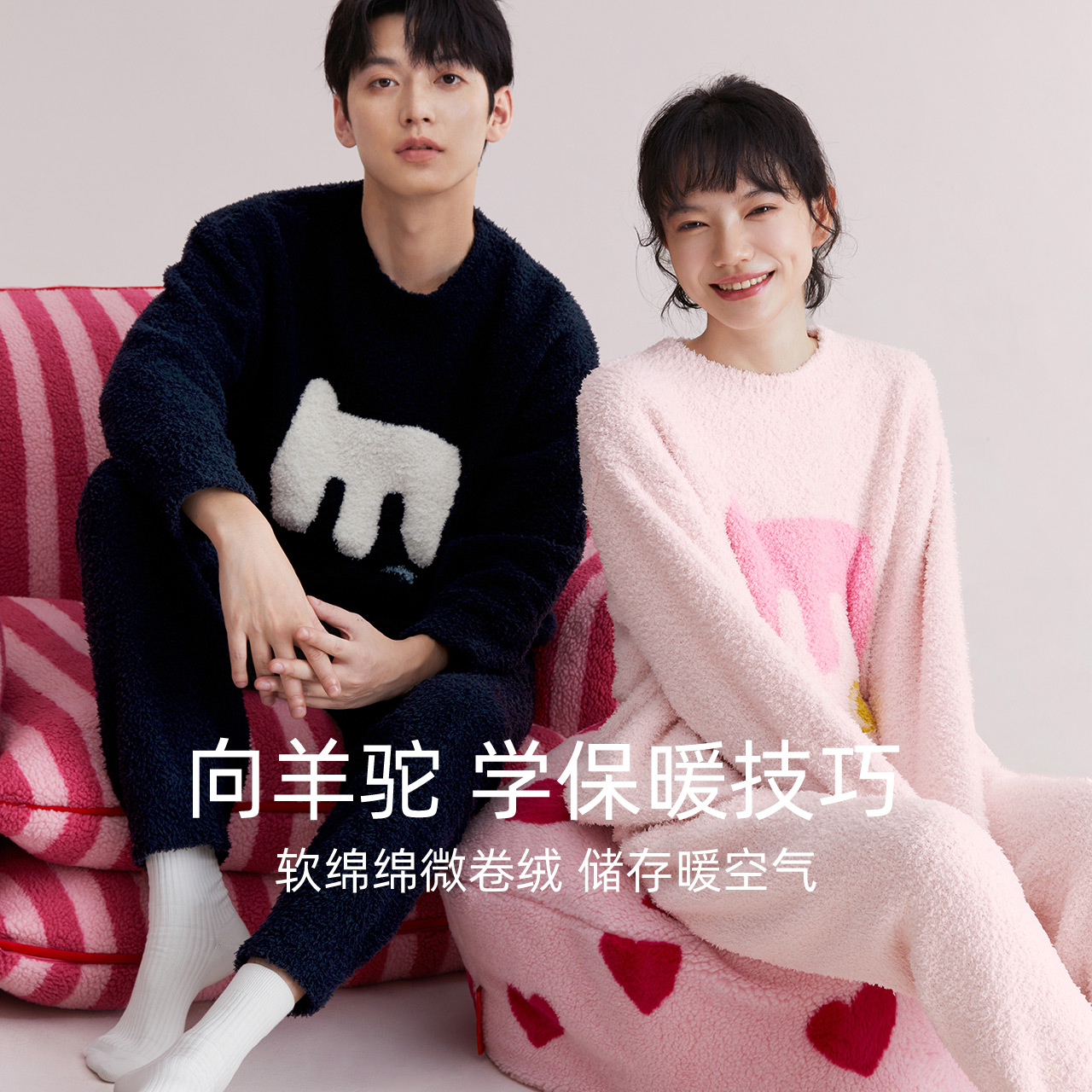 红豆半边绒睡衣女情侣保暖可外穿抗静电珊瑚绒男士 秋冬 家居服套装
