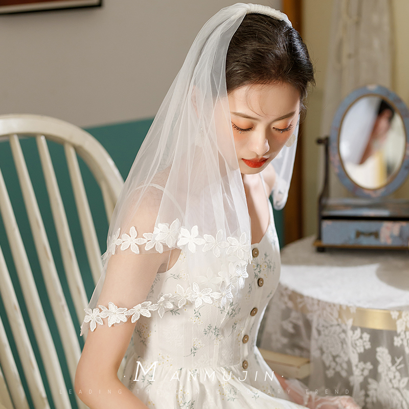 法式 头纱 超仙蕾丝花边小清新头纱新娘结婚领证旅拍照头饰双层短款