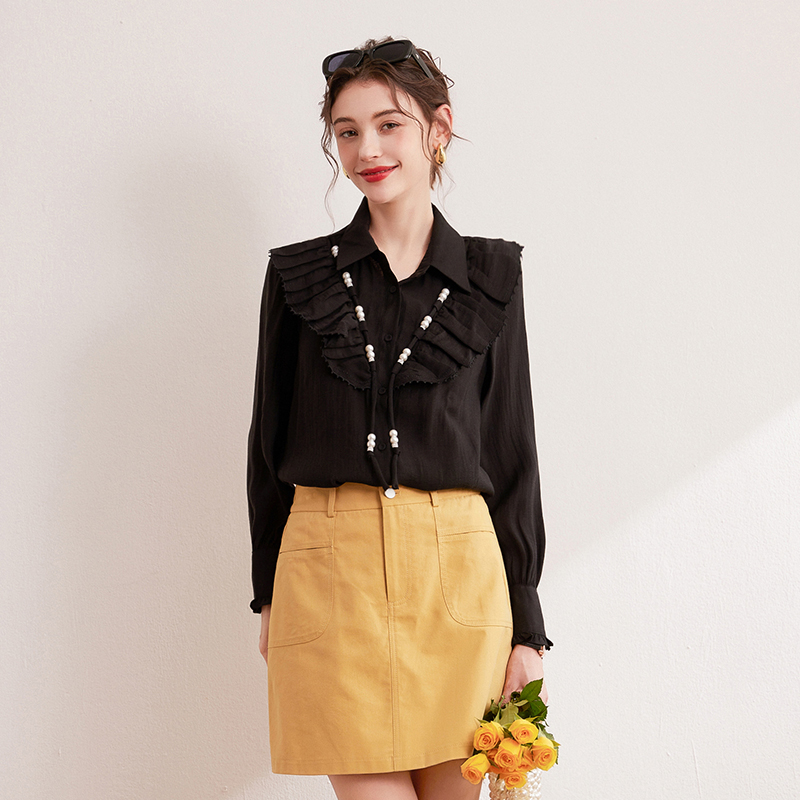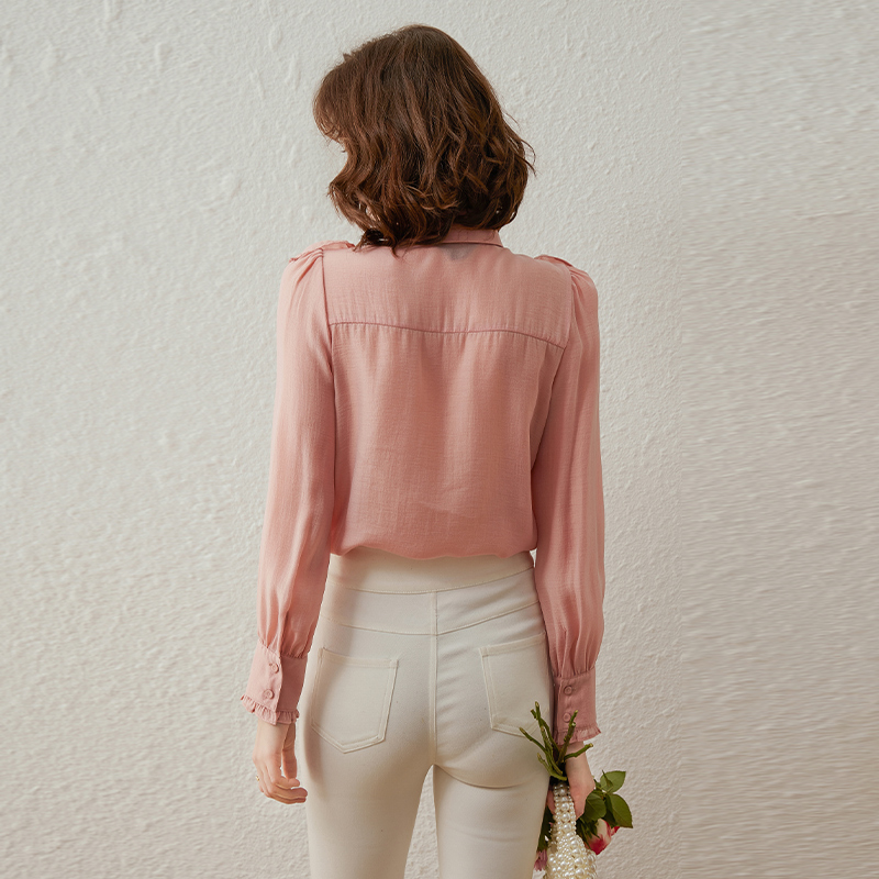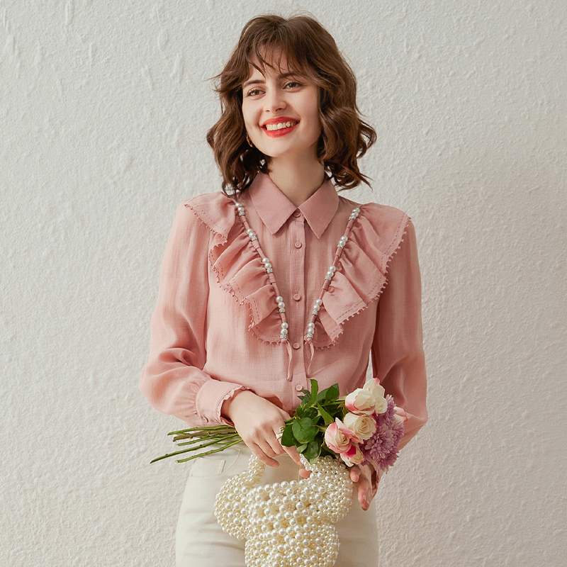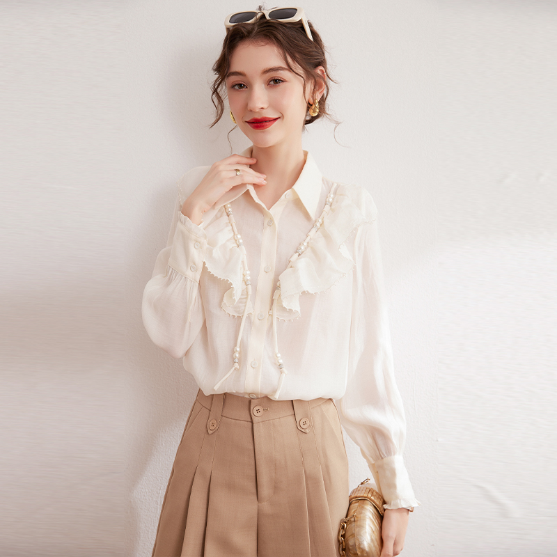 温柔优雅轻薄天丝莱赛尔衬衣女 新款 白鹿语气质荷叶边串珠衬衫 春季