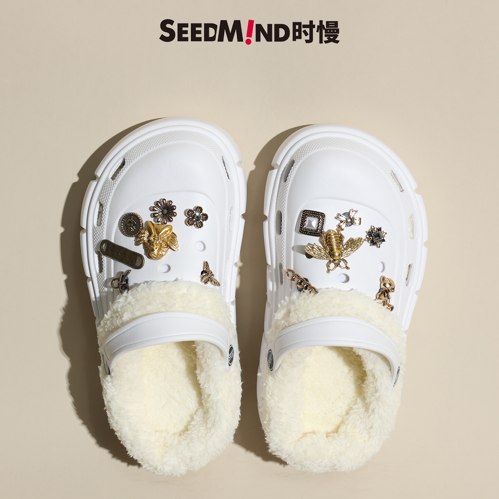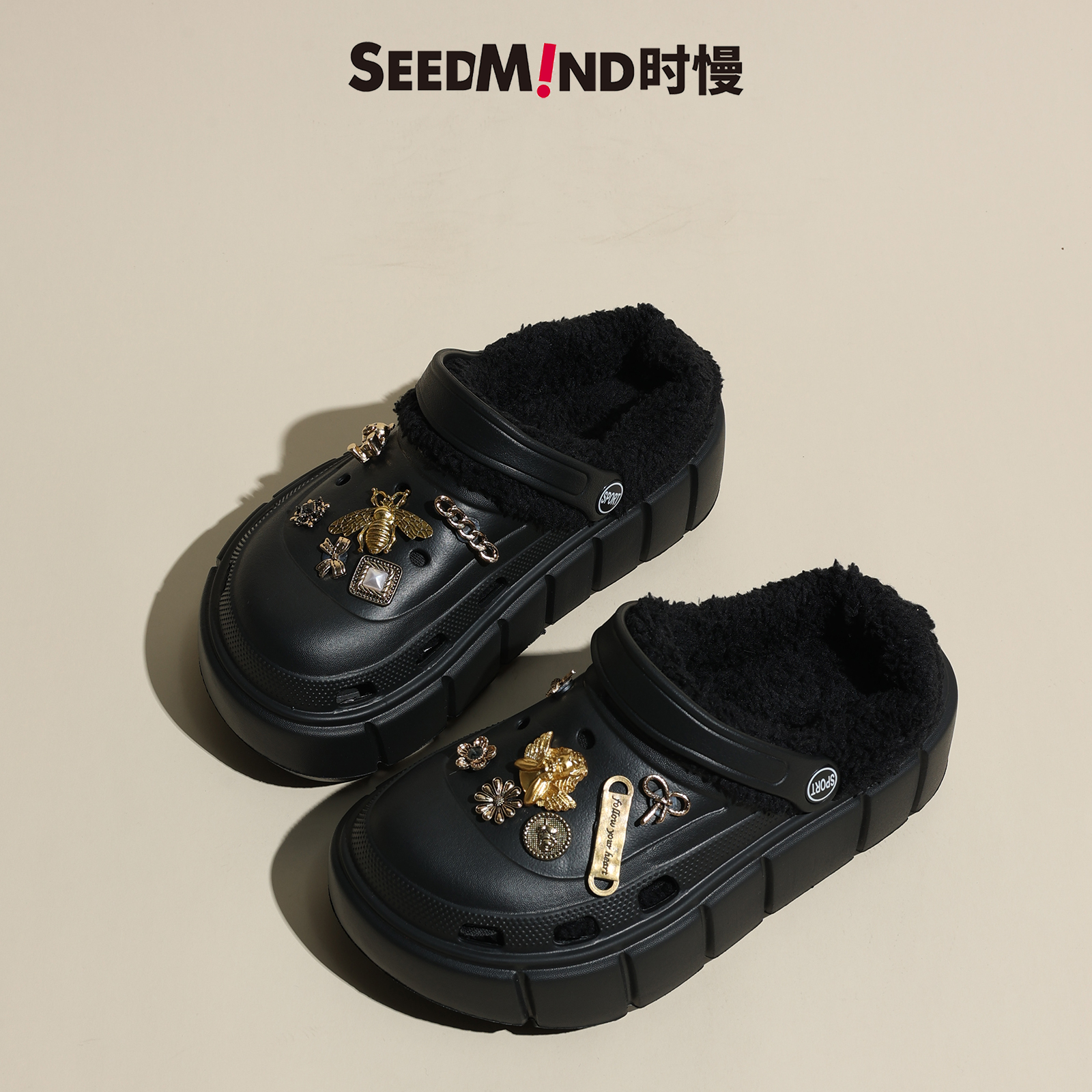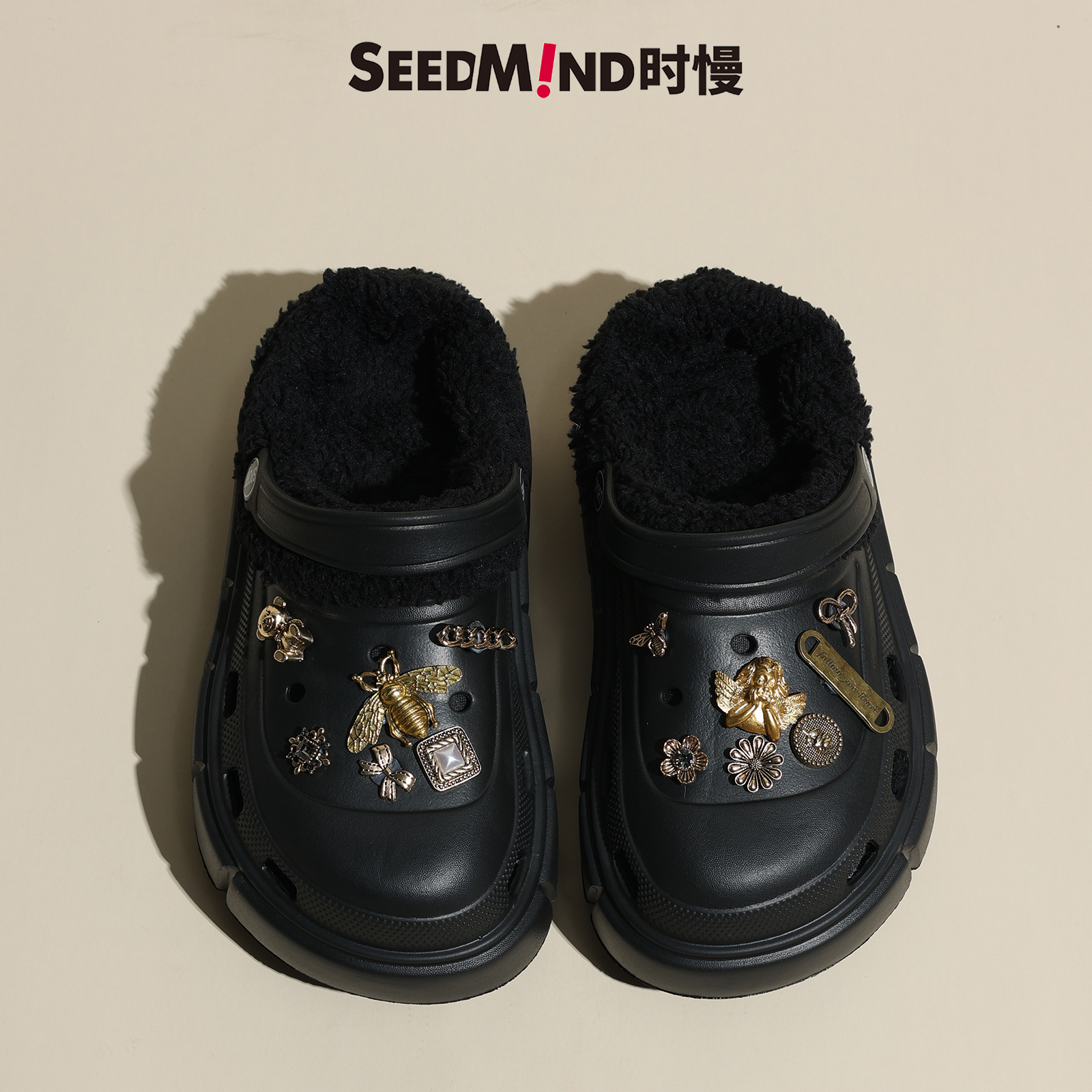可拆卸女士黑色外穿保暖厚底加棉拖鞋 冬季 毛毛 冬款 时慢加绒洞洞鞋