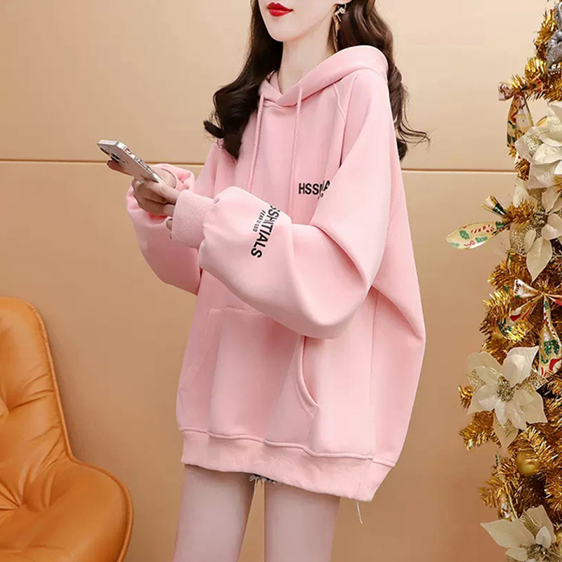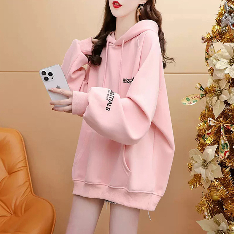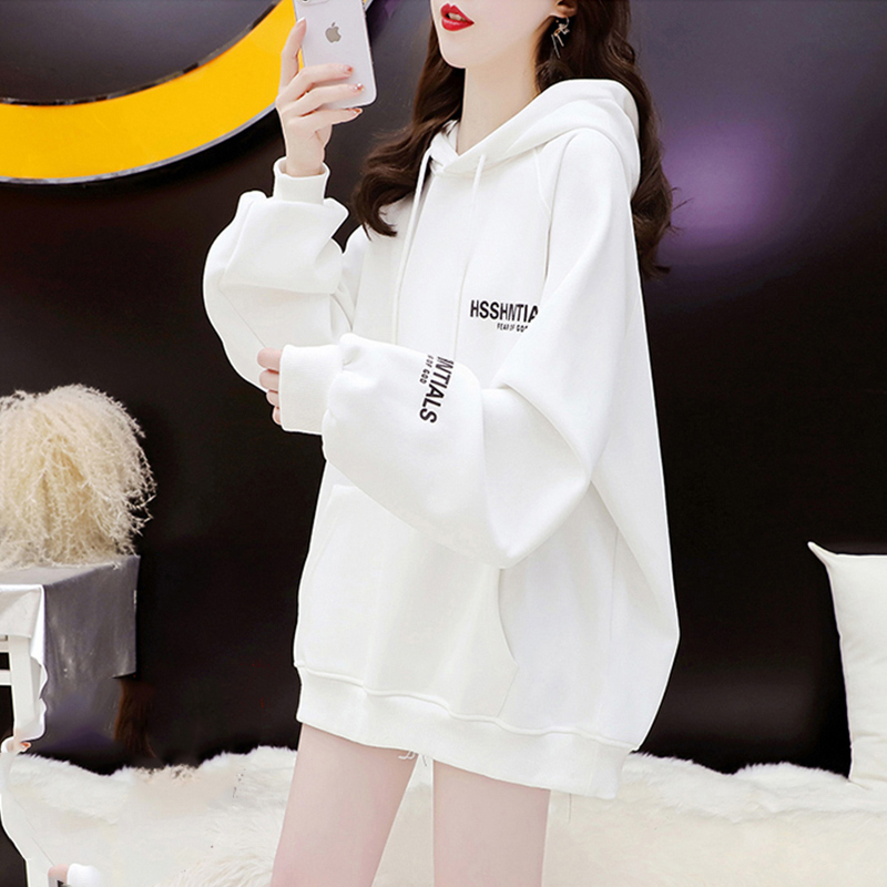宽松百搭大码 韩版 胖mm连帽上衣 纯棉卫衣女秋冬新款 字母印花中长款