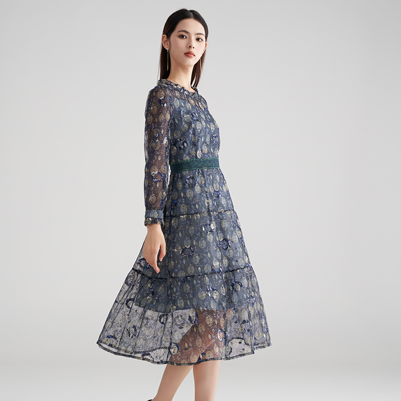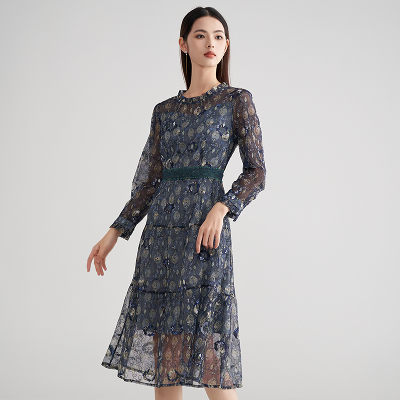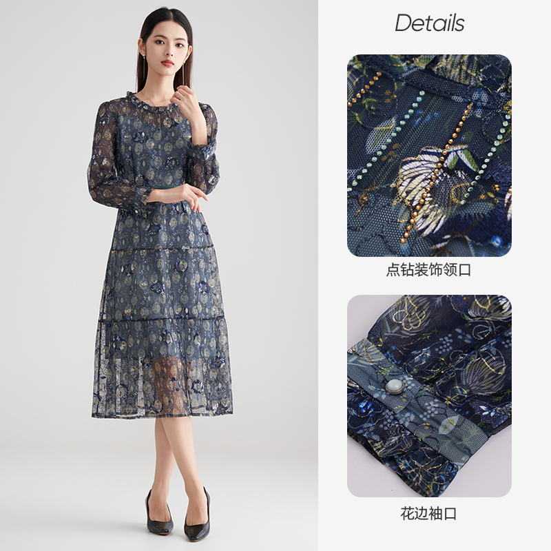 马天奴春秋新款 气质简约流行 绿色印花网纱连衣裙烫钻收腰裙子时尚