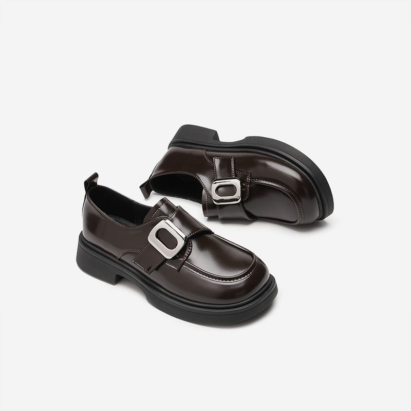套脚乐福鞋 时尚 门店发货 春秋复古方扣百搭黑色小皮鞋 奥康女鞋