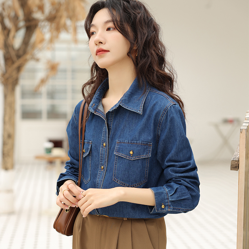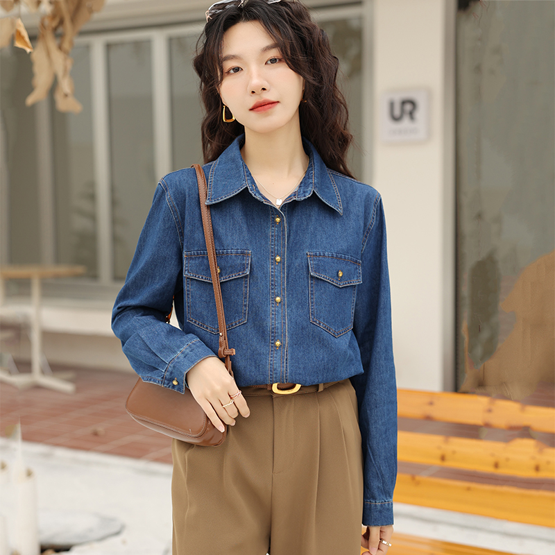 衬衣小个子正肩不卷边上衣 内搭叠穿长袖 蓝色软牛仔衬衫 女2025春季