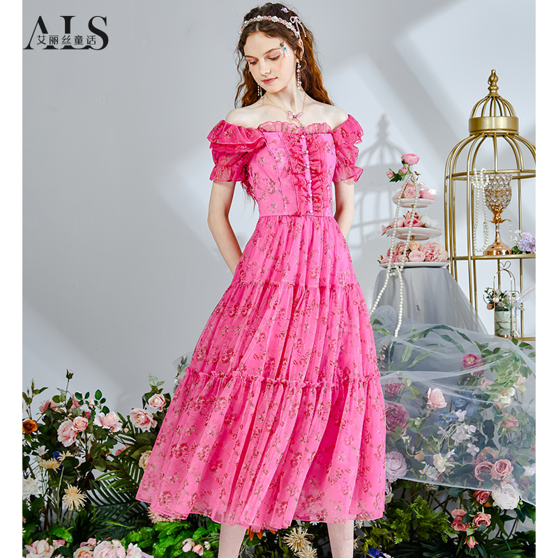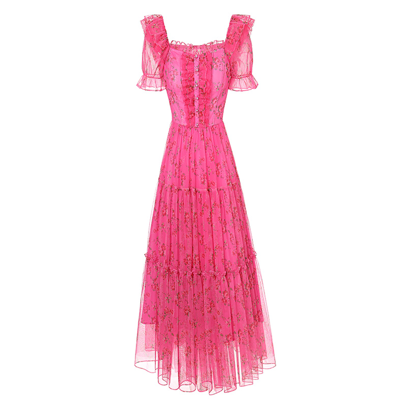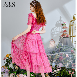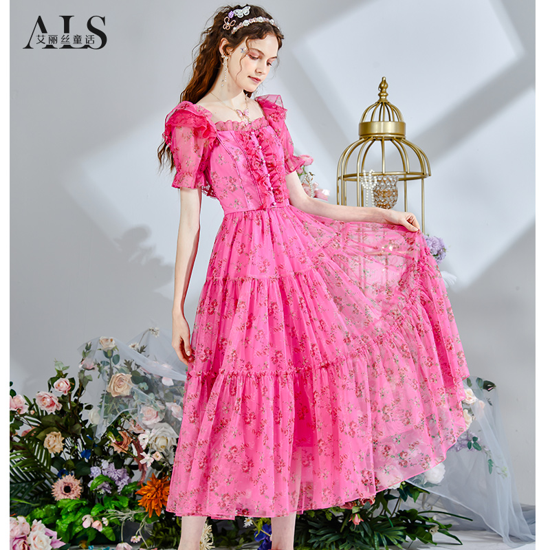 碎花裙短袖 中长款 方领连衣裙 网纱新款 艾丽丝甜美公主裙女2025夏季