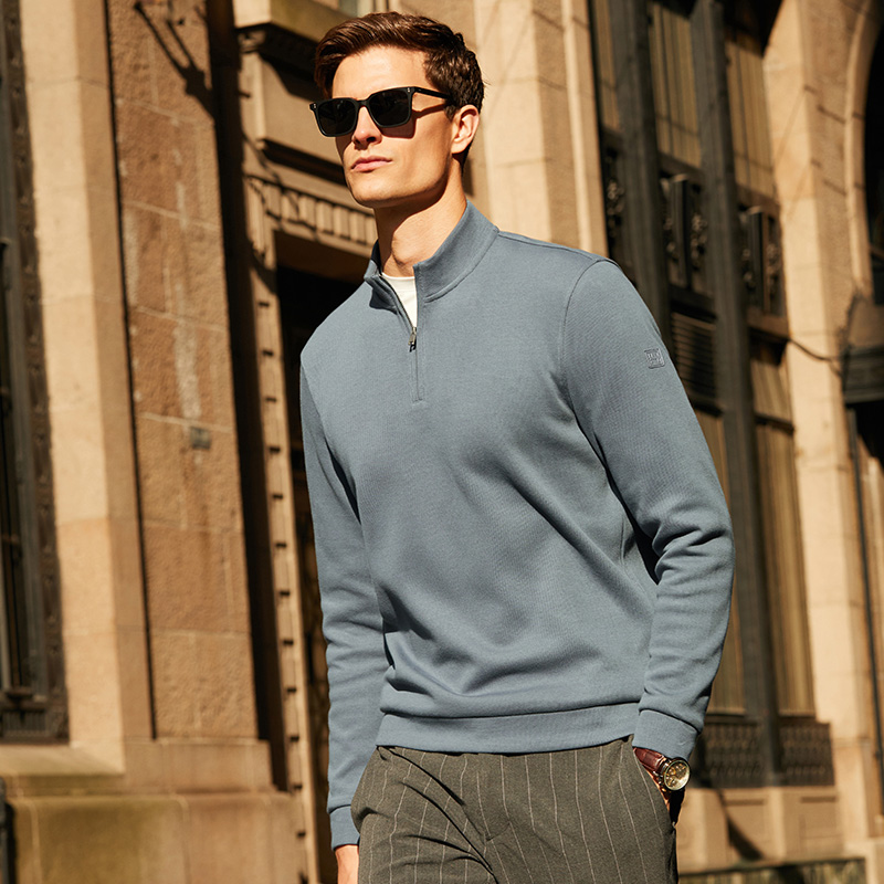 高街痞帅肌理感卫衣宽松休闲打底衫 V37老钱风亨利领长袖 T恤男秋季