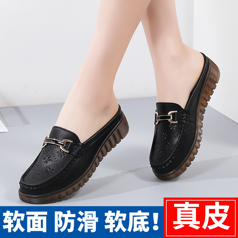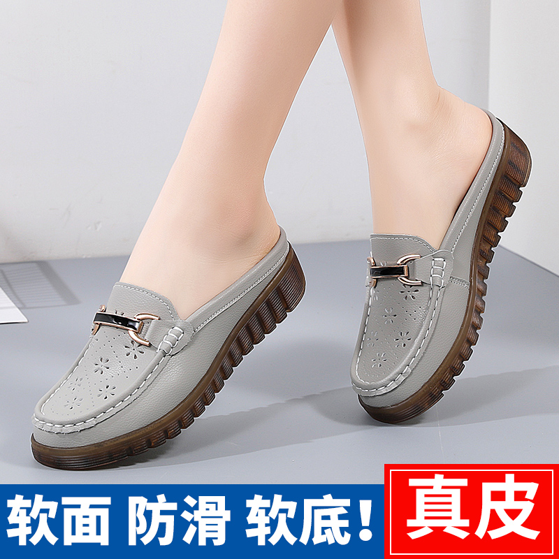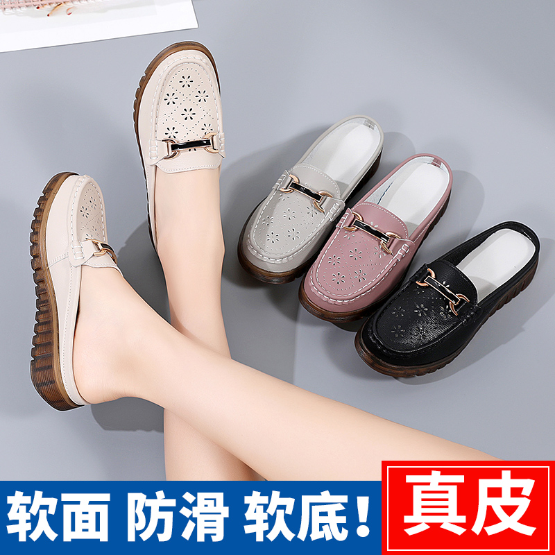 防滑凉拖 外穿镂空透气软底一脚蹬妈妈休闲皮鞋 真皮包头拖鞋 女夏季