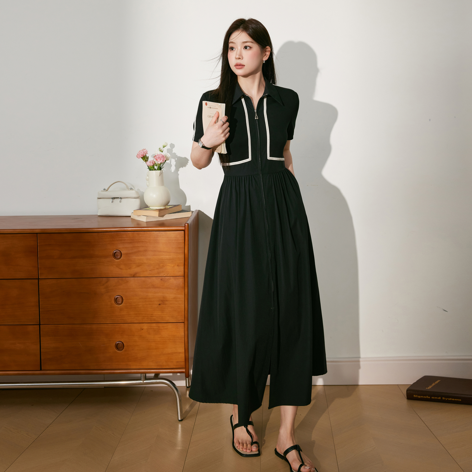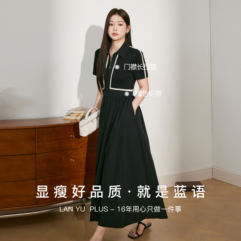 新款 赫本风黑色收腰显瘦连衣裙夏季 polo领气质a字裙 女装 蓝语大码