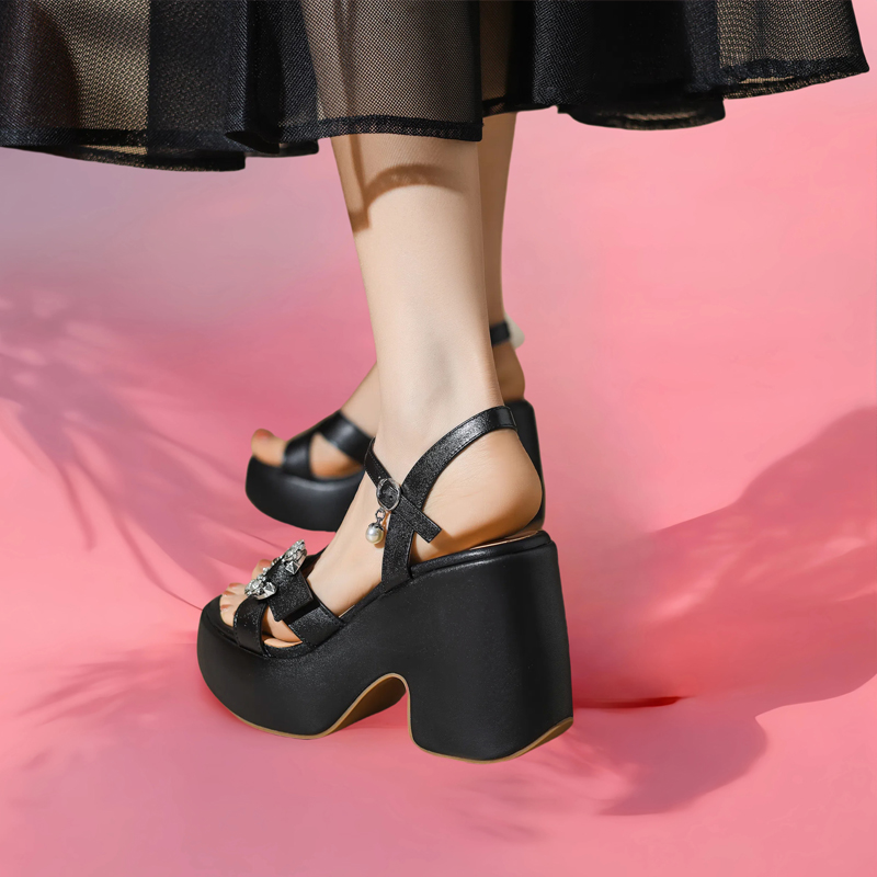 水钻露趾不累脚真皮松糕高跟鞋 2025新款 粗跟 女夏季 踩屎感厚底凉鞋