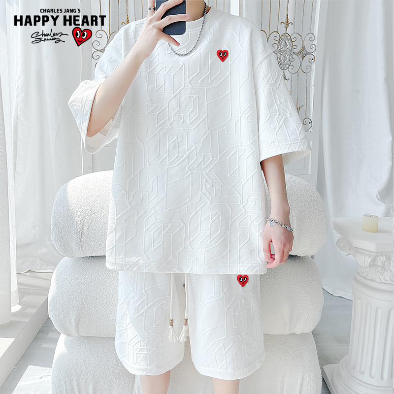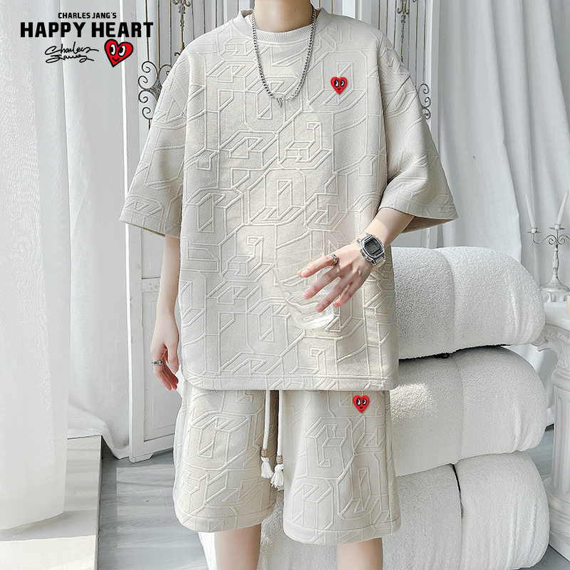 短裤 查尔斯桃心 短袖 男女夏季 宽松情侣运动潮牌 纹理提花休闲套装