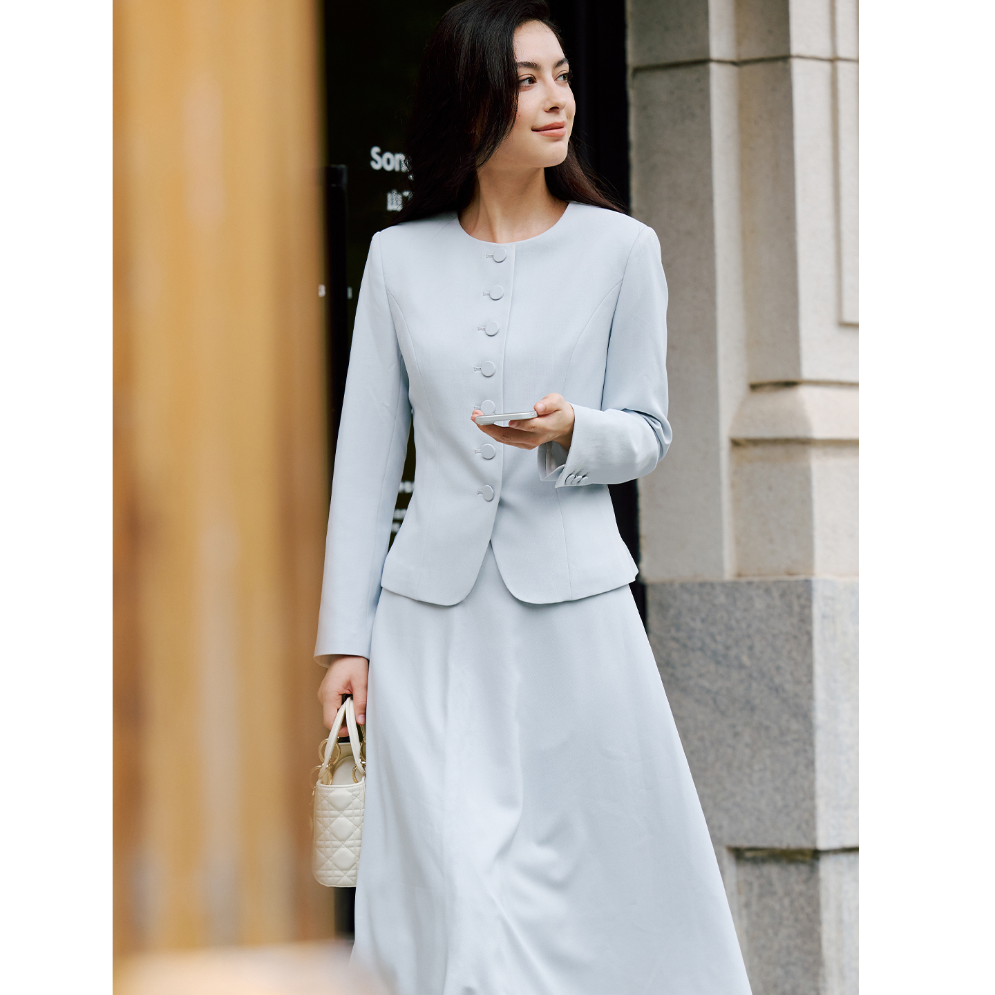 外套女圆领单排扣千金风通勤 浅蓝西装 TieForHer Piana孟羽童同款