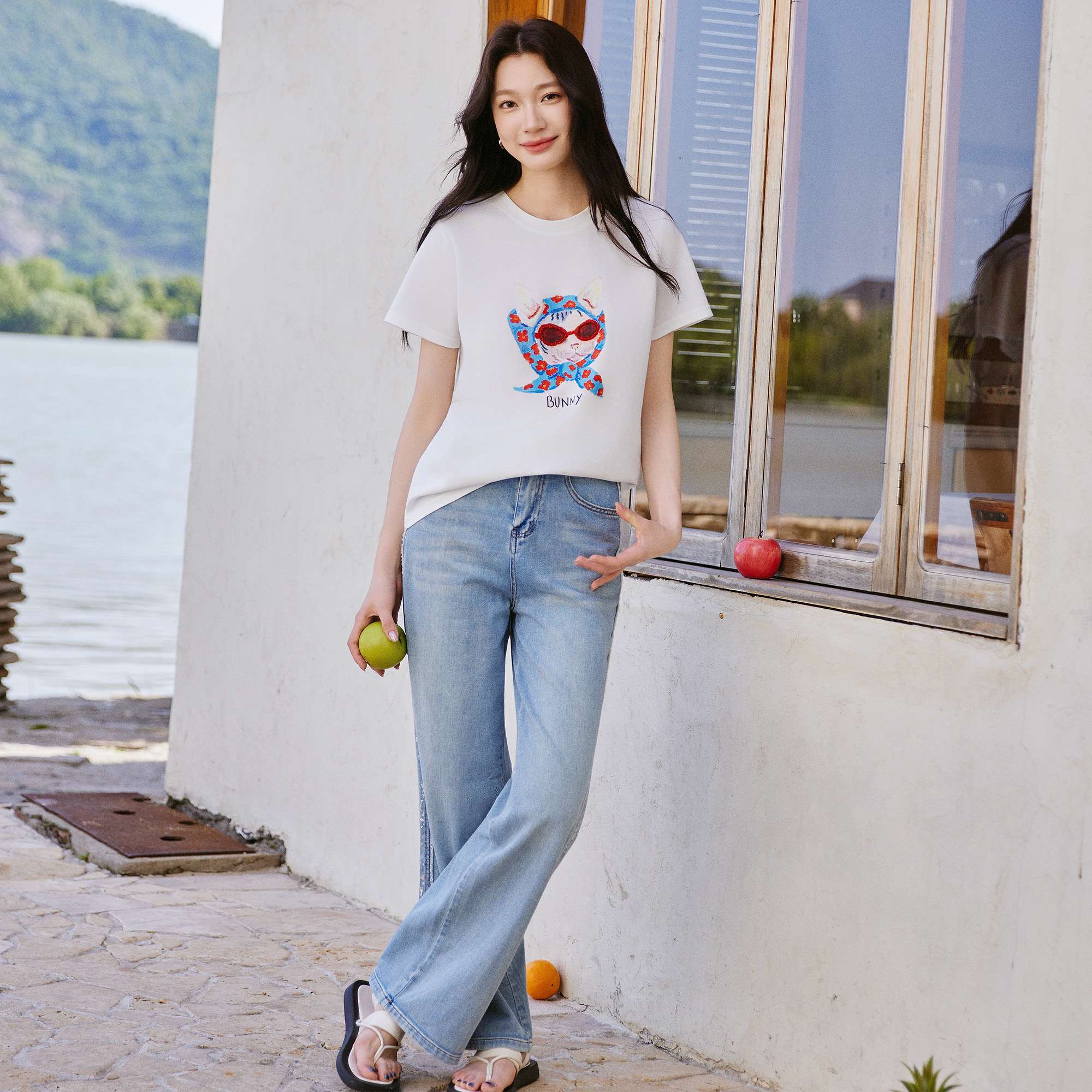 直筒阔腿裤 女春秋高腰显瘦小个子窄版 高街熊猫刺绣微喇牛仔裤 美式