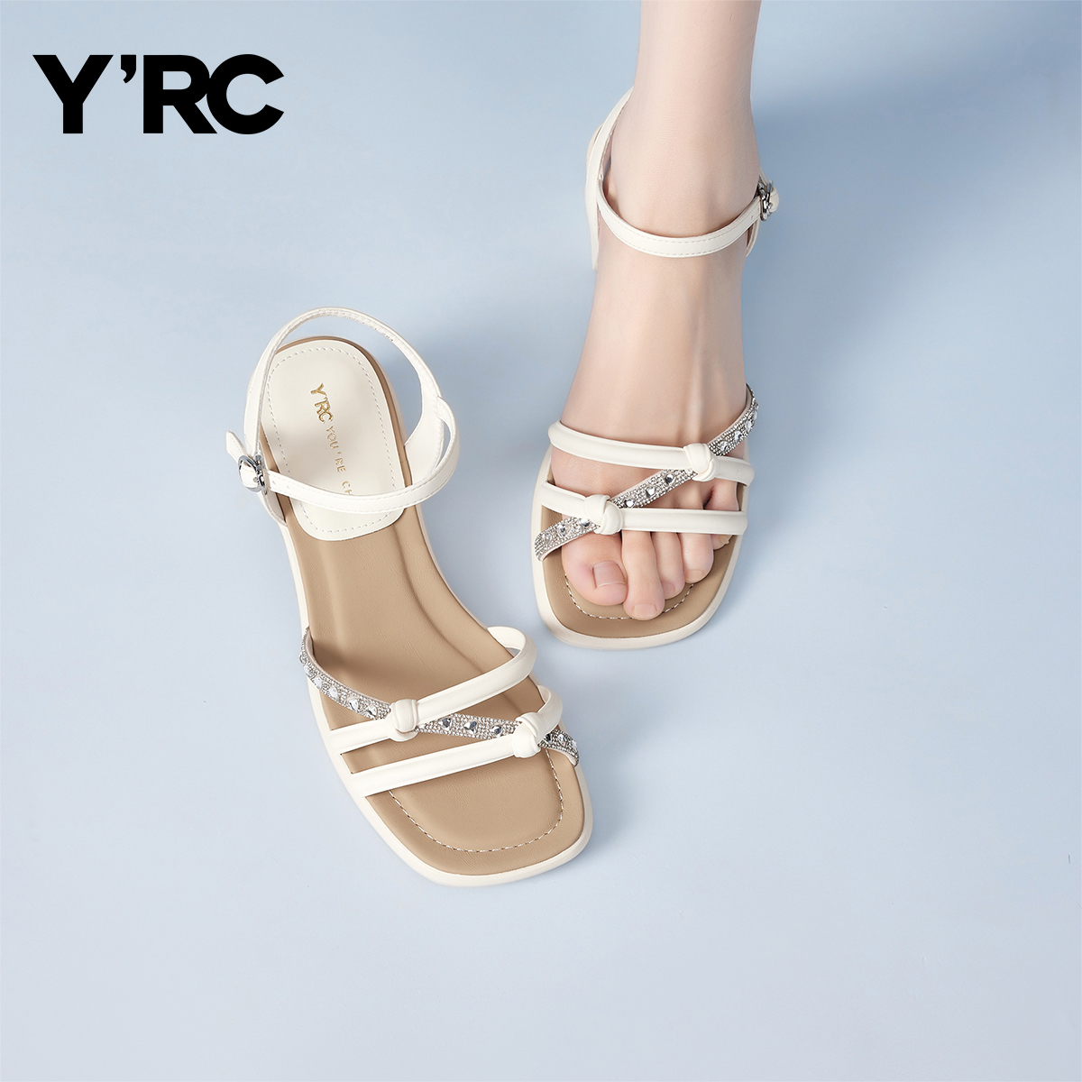 百搭气质水钻一字带露趾高跟鞋 YRC粗跟凉鞋 法式 新款 女2025夏季