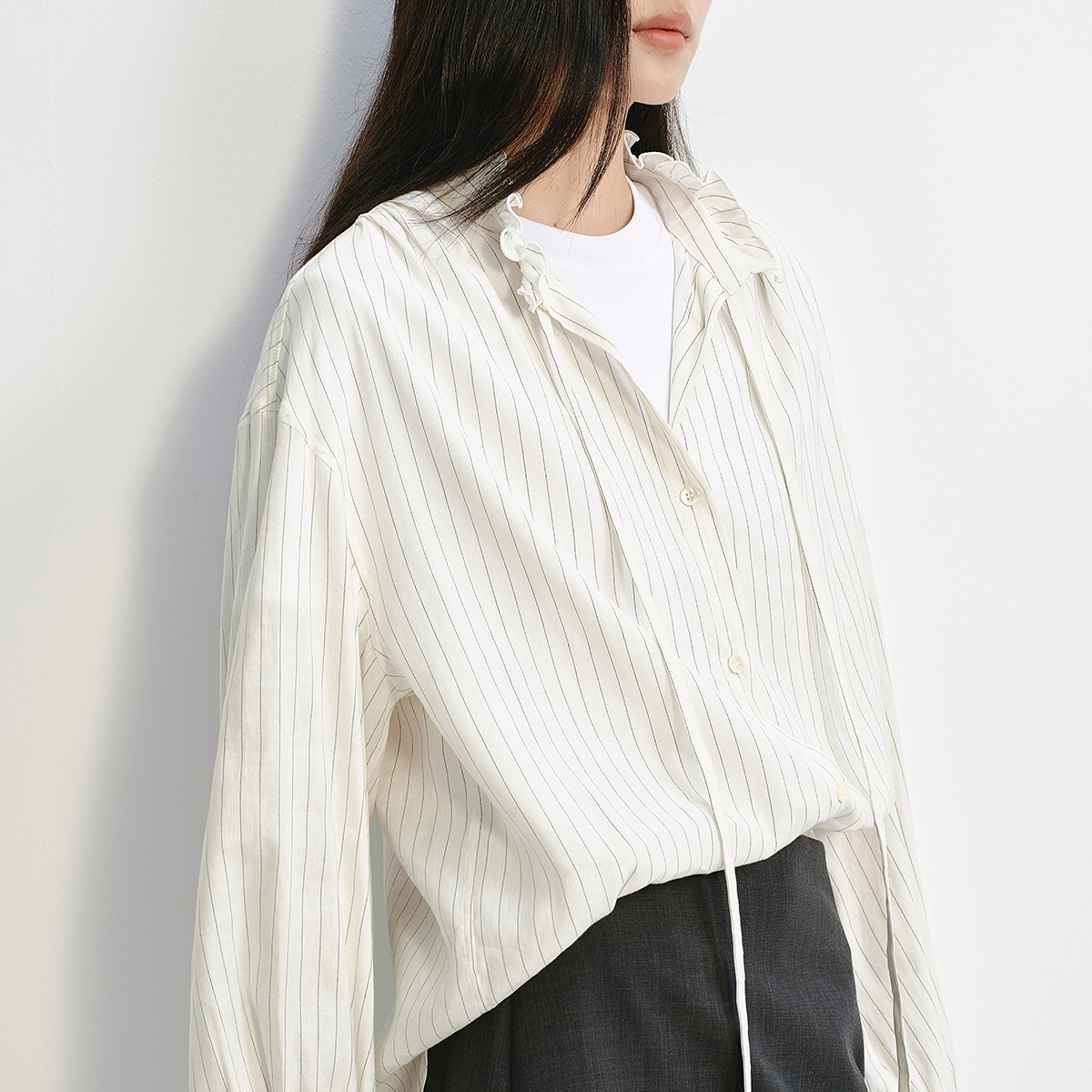 圆领木耳边装 新款 饰抽绳衬衣上衣 女25秋季 德玛纳文艺复古牛仔衬衫