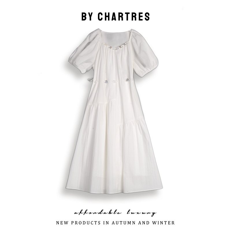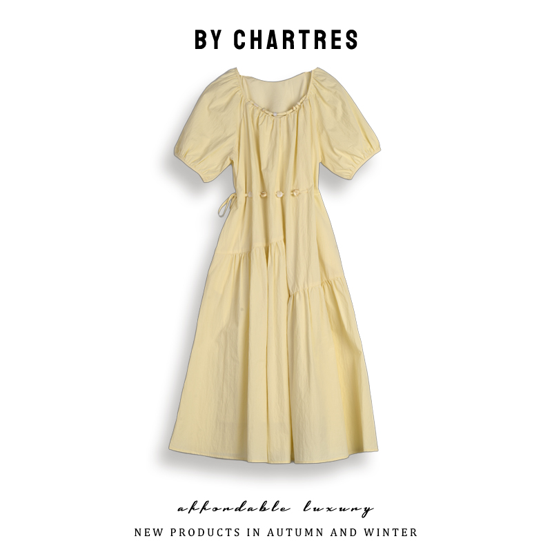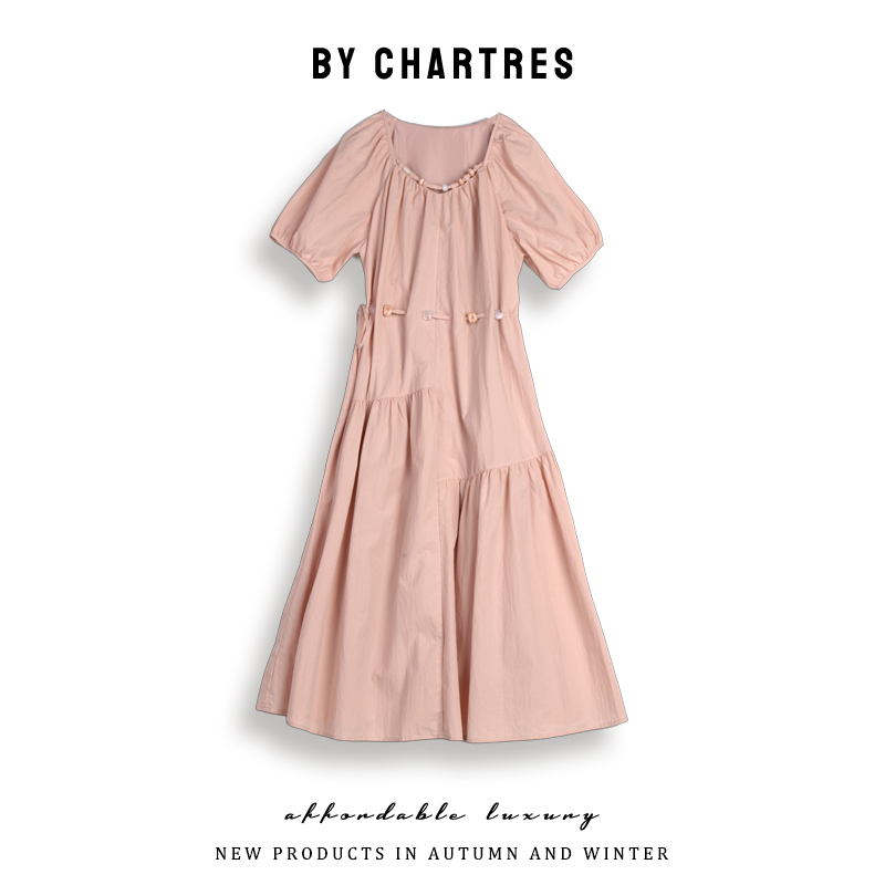 鹅卵石腰带粉色中长款 夏新款 高腰A字裙 连衣裙 显瘦圆领减龄泡泡袖