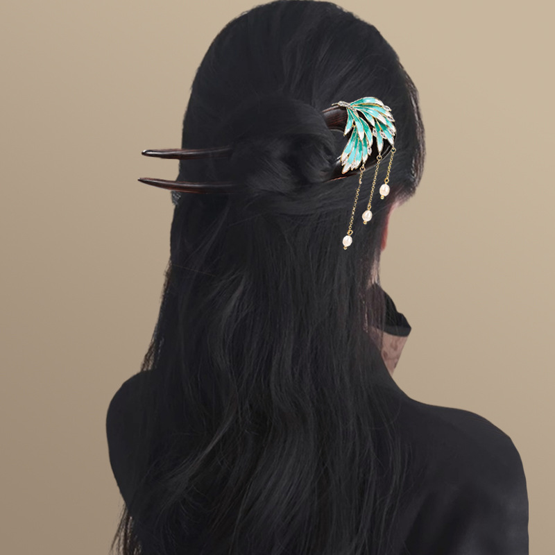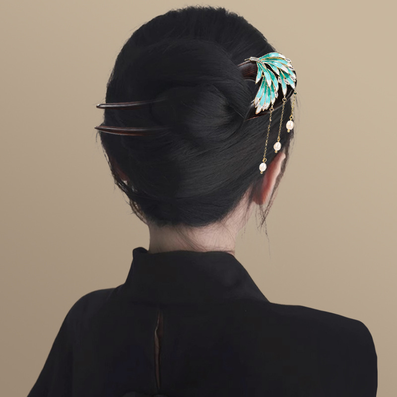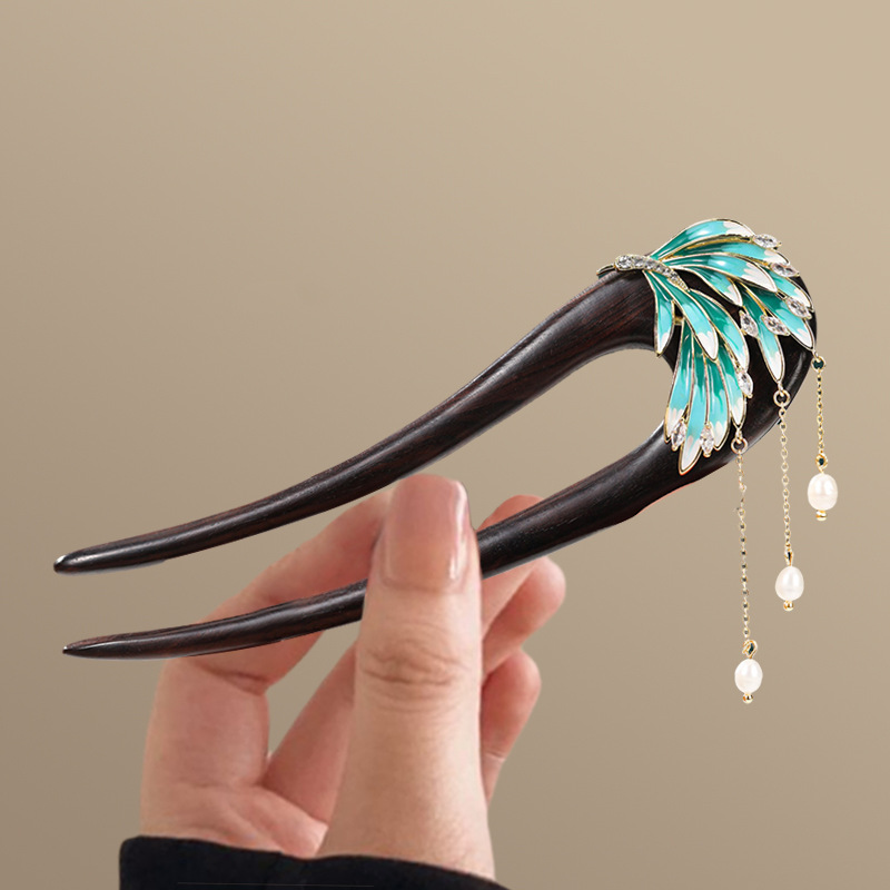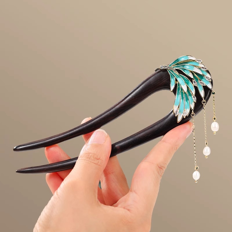 发簪古风高级感旗袍发钗拎环女 新中式 云霓雀羽 黑檀木u型发簪