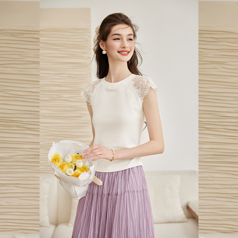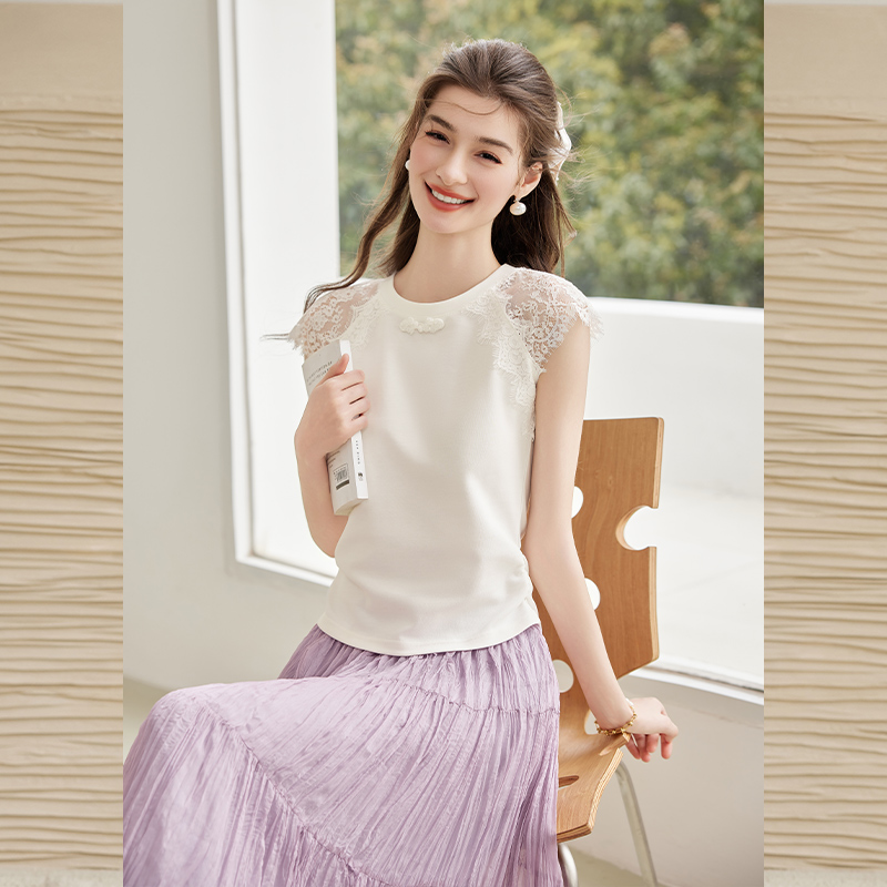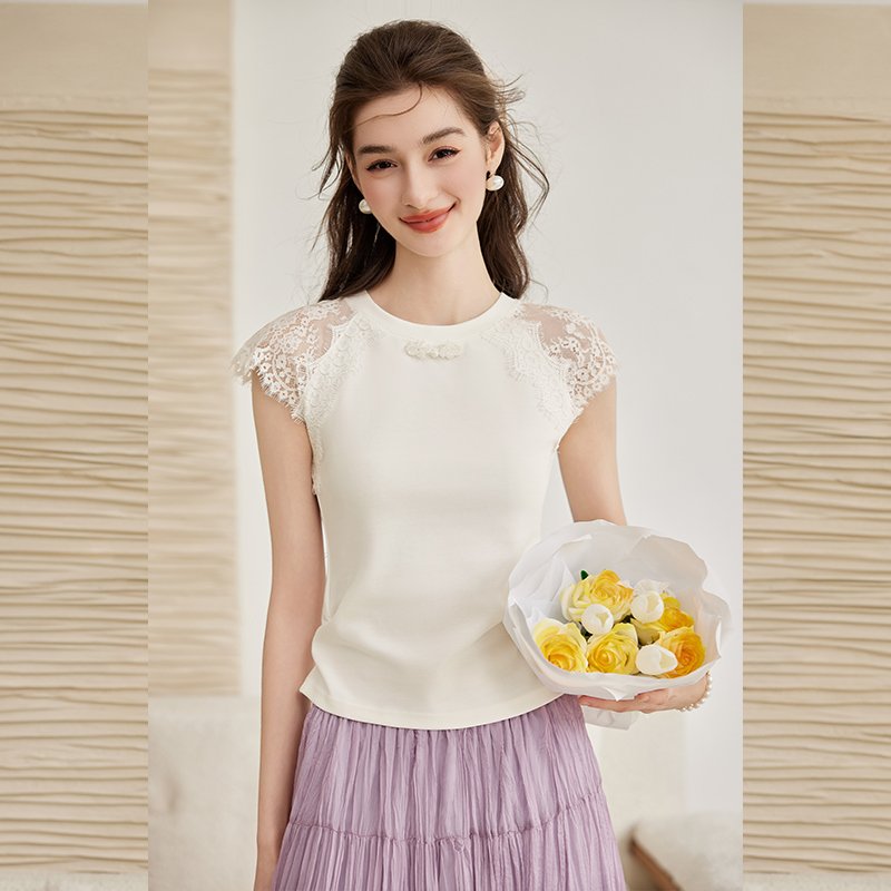 白鹿语国风盘扣蕾丝拼接短袖 设计感甜美收腰显瘦休闲T恤 25夏新款