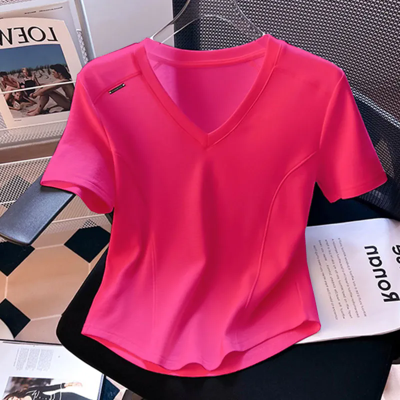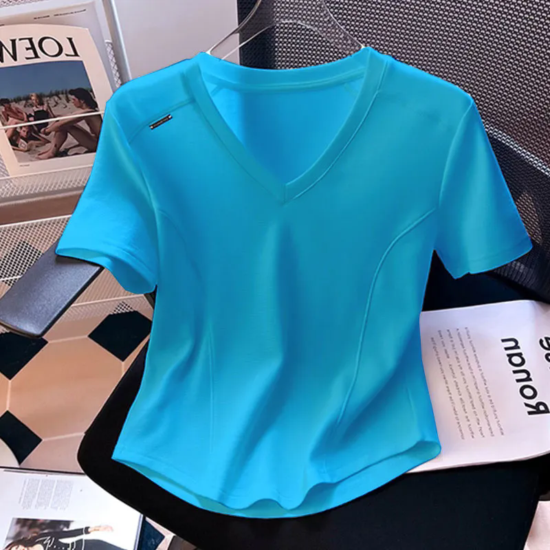 露锁骨正肩短款 新款 修身 T恤女新款 上衣女潮 纯棉弧形下摆V领短袖