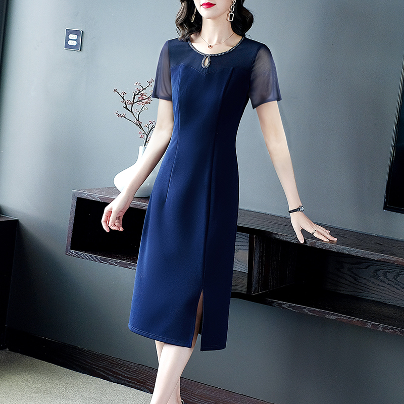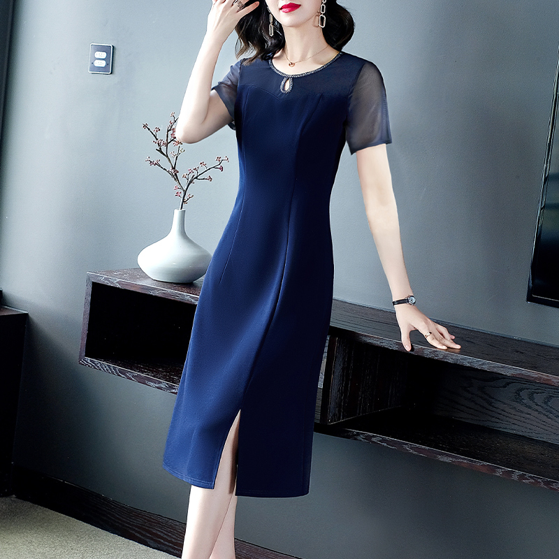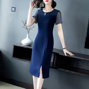 圆领连衣裙 气质开叉妈妈夏装 高腰减龄显瘦直筒2025新款 女夏中长款