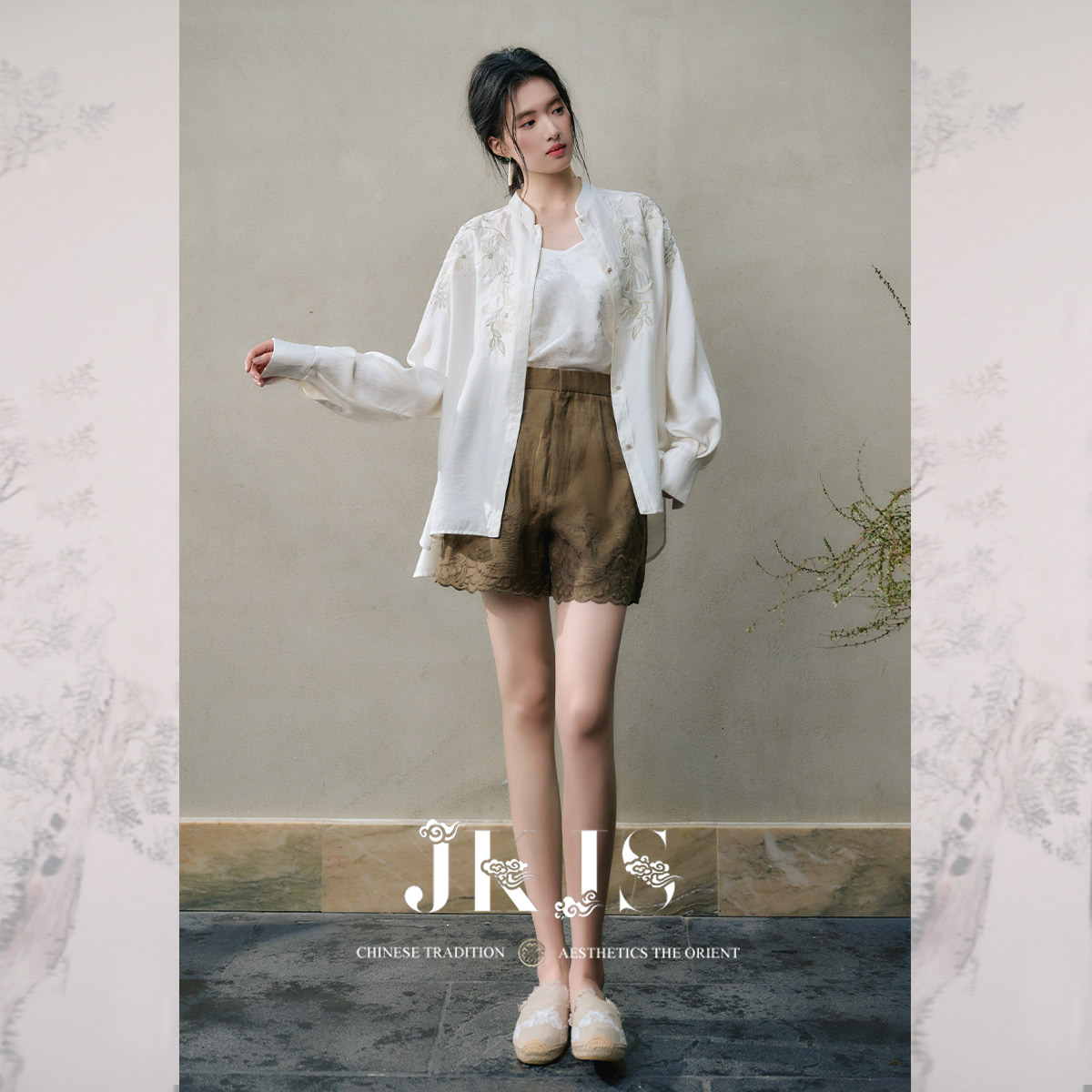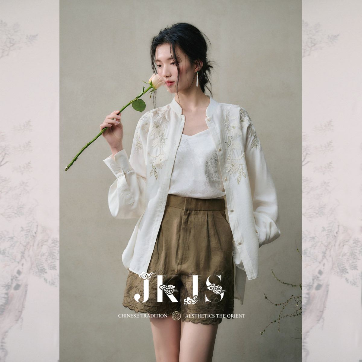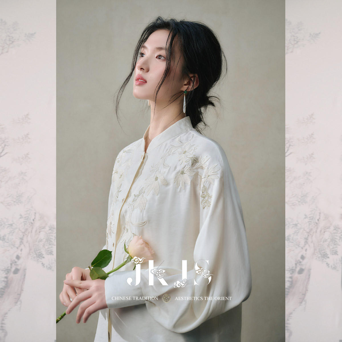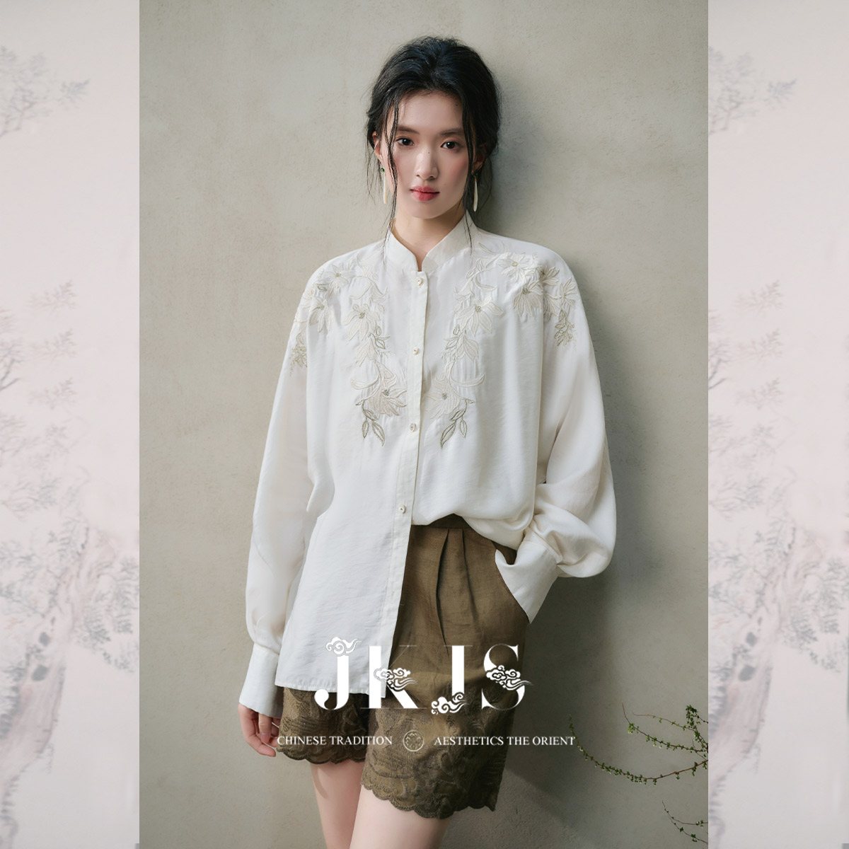 江南先生NewJNXS腊肠狗刺绣长袖 秋不对称斜门襟男女衬衣 条纹衬衫
