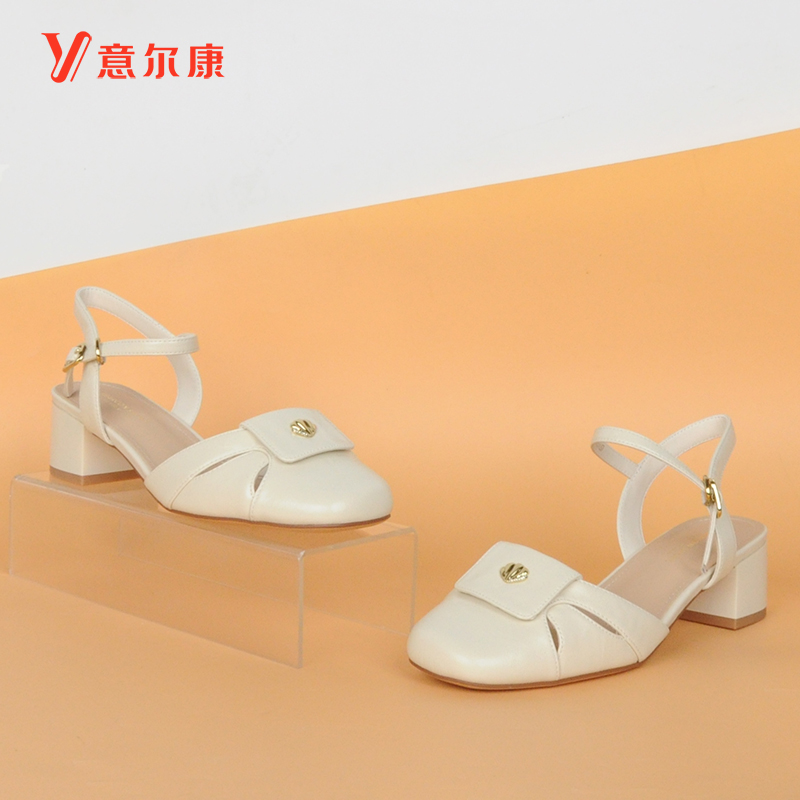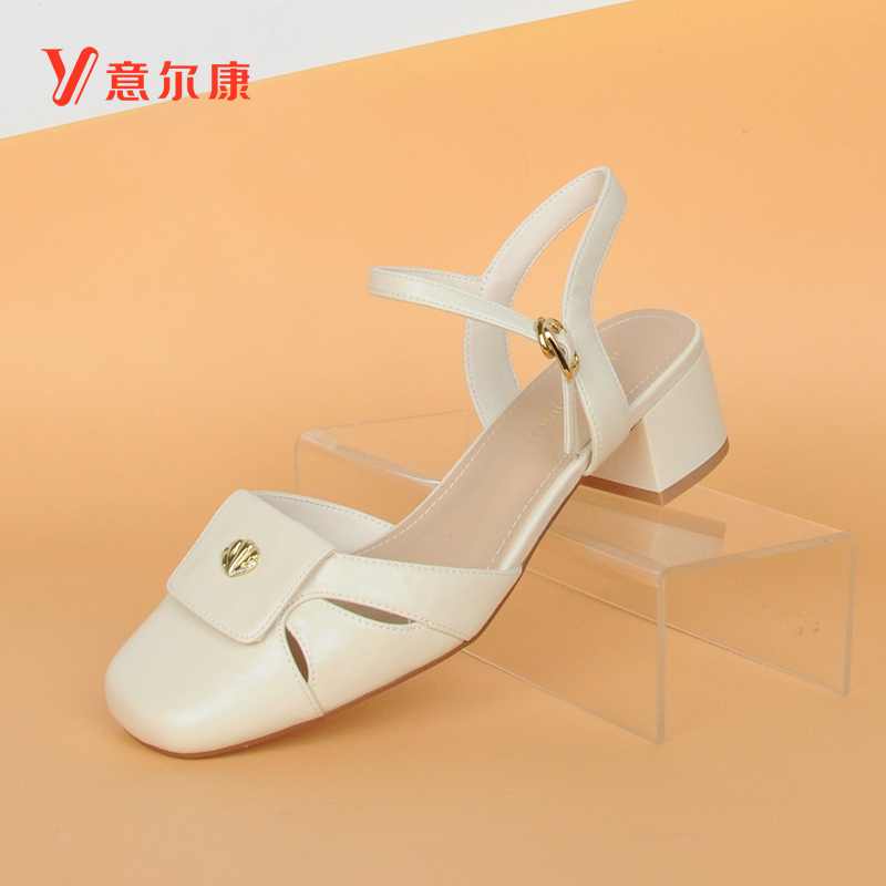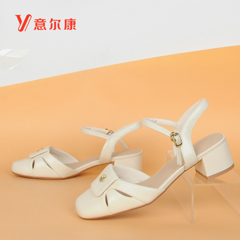 2025中后空通勤粗跟镂空一字带方头女士凉鞋 意尔康包头凉鞋 女夏季