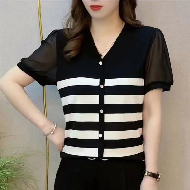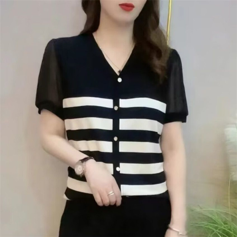时尚 宽松显瘦大码 V领冰丝短袖 妈妈装 条纹t恤 上衣女夏季 2025年新款