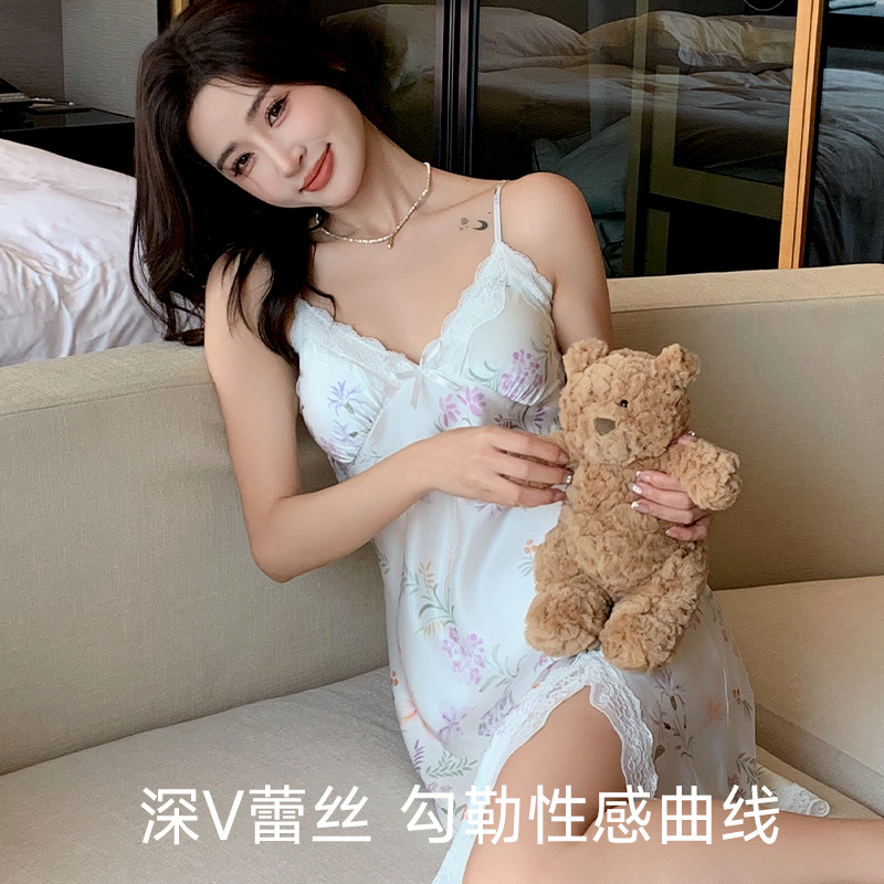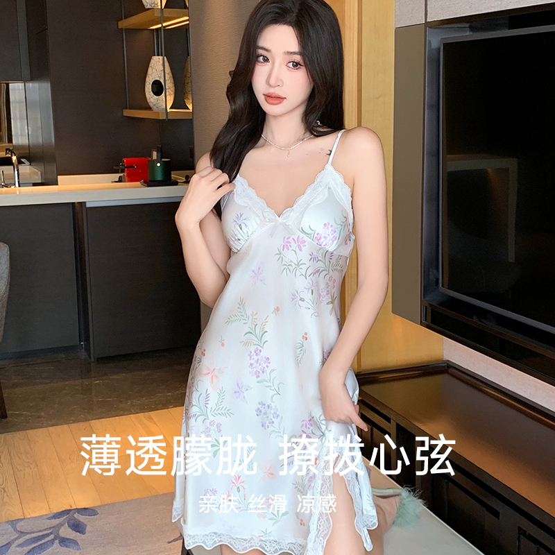 2025新款 性感冰丝睡袍纯欲风高级感蕾丝吊带睡衣 睡裙女春秋夏薄款
