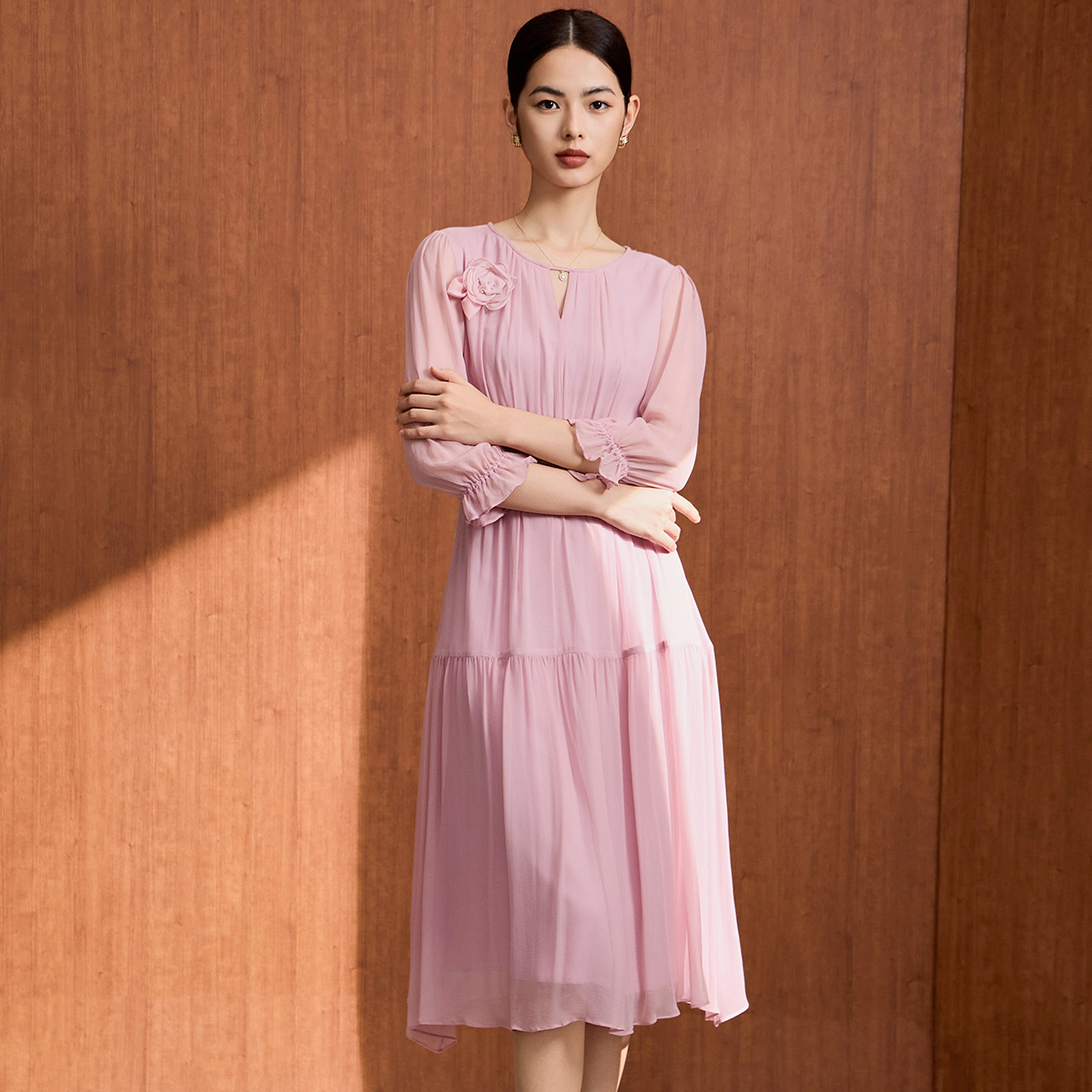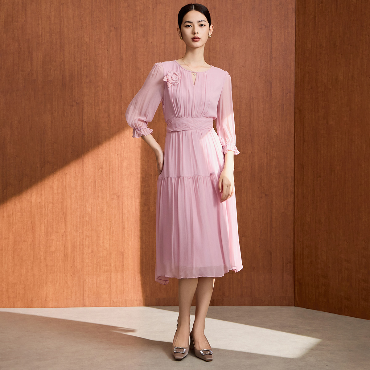 Vero 含棉捏褶老钱风中长裙32537D011 Moda连衣裙女2025秋冬新款
