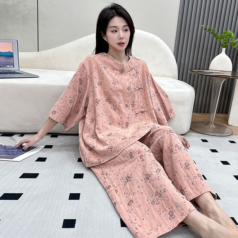 九分裤 中式 复古中袖 睡衣纯棉女夏季 家居服棉纱200斤 国风胖mm大码
